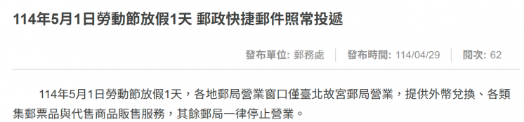 郵局也於 2025/4/29 對外公告,說明 114 年 5 月 1 日勞動節放假 1 天。