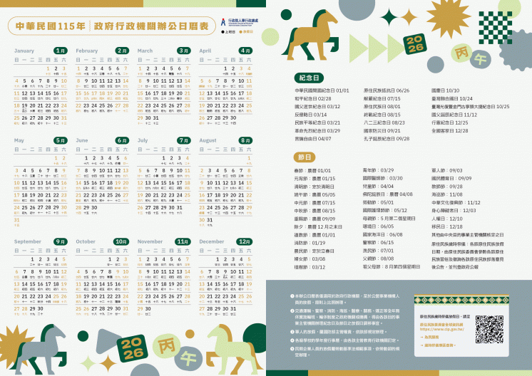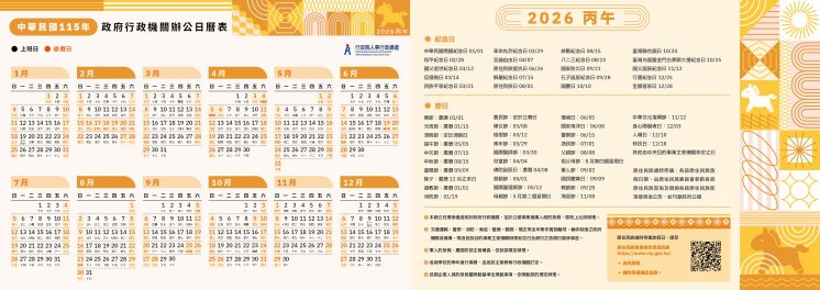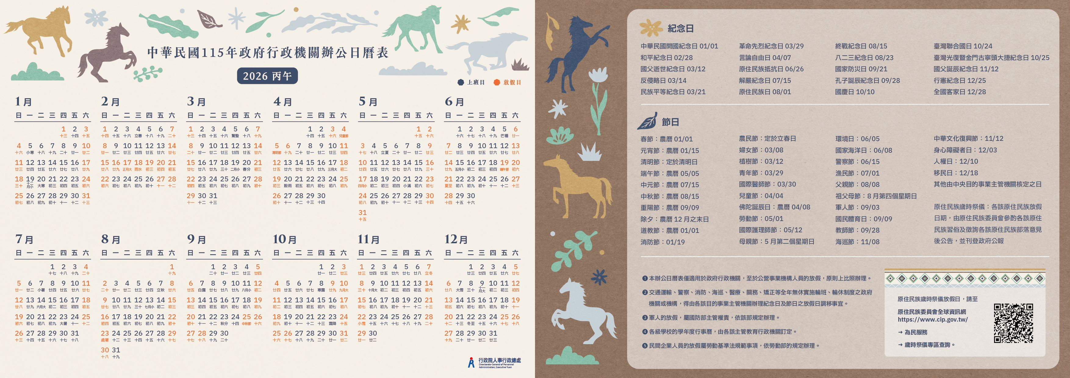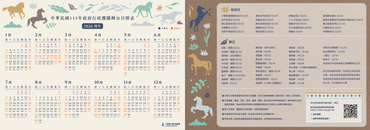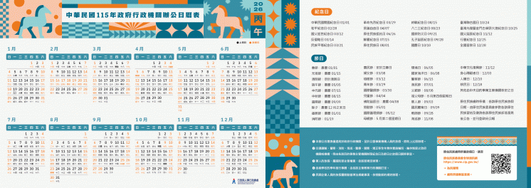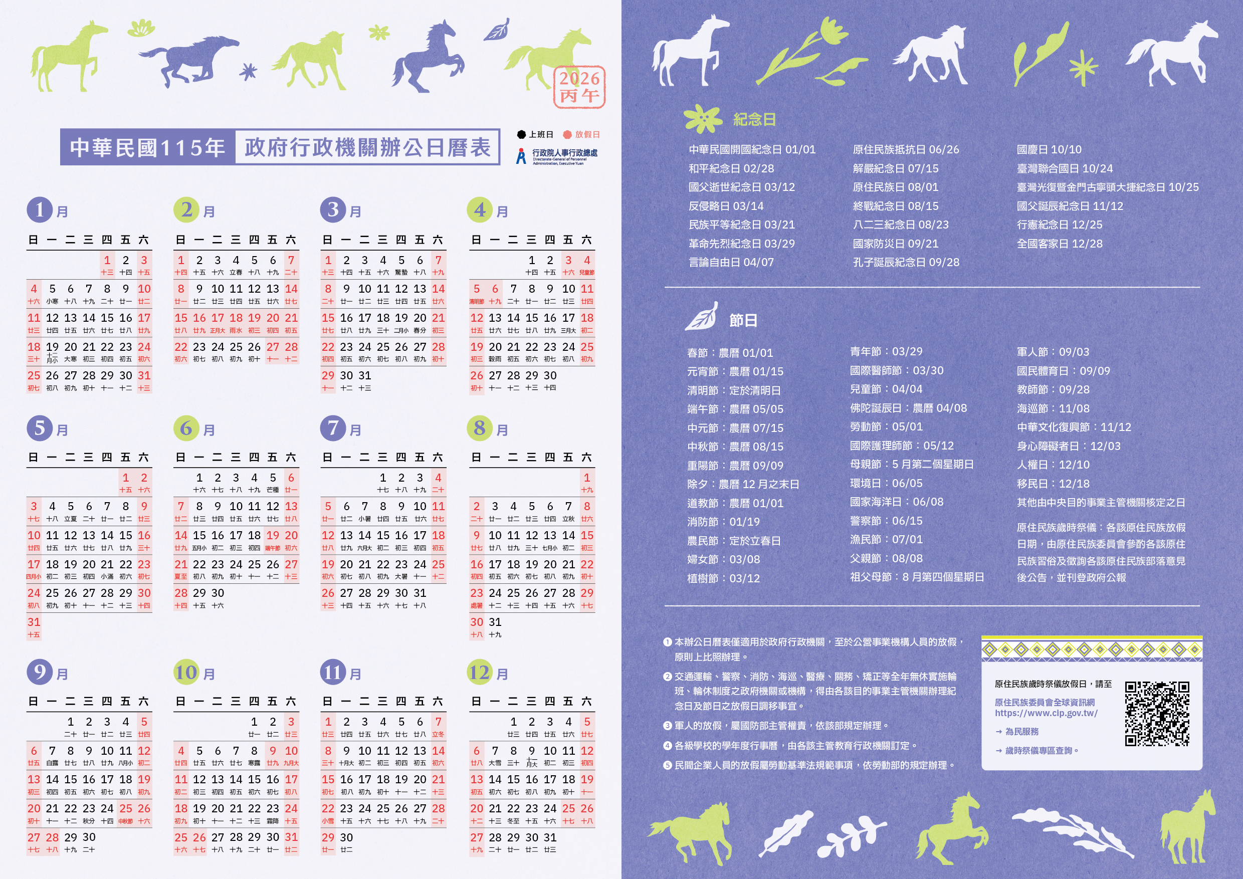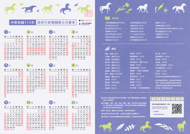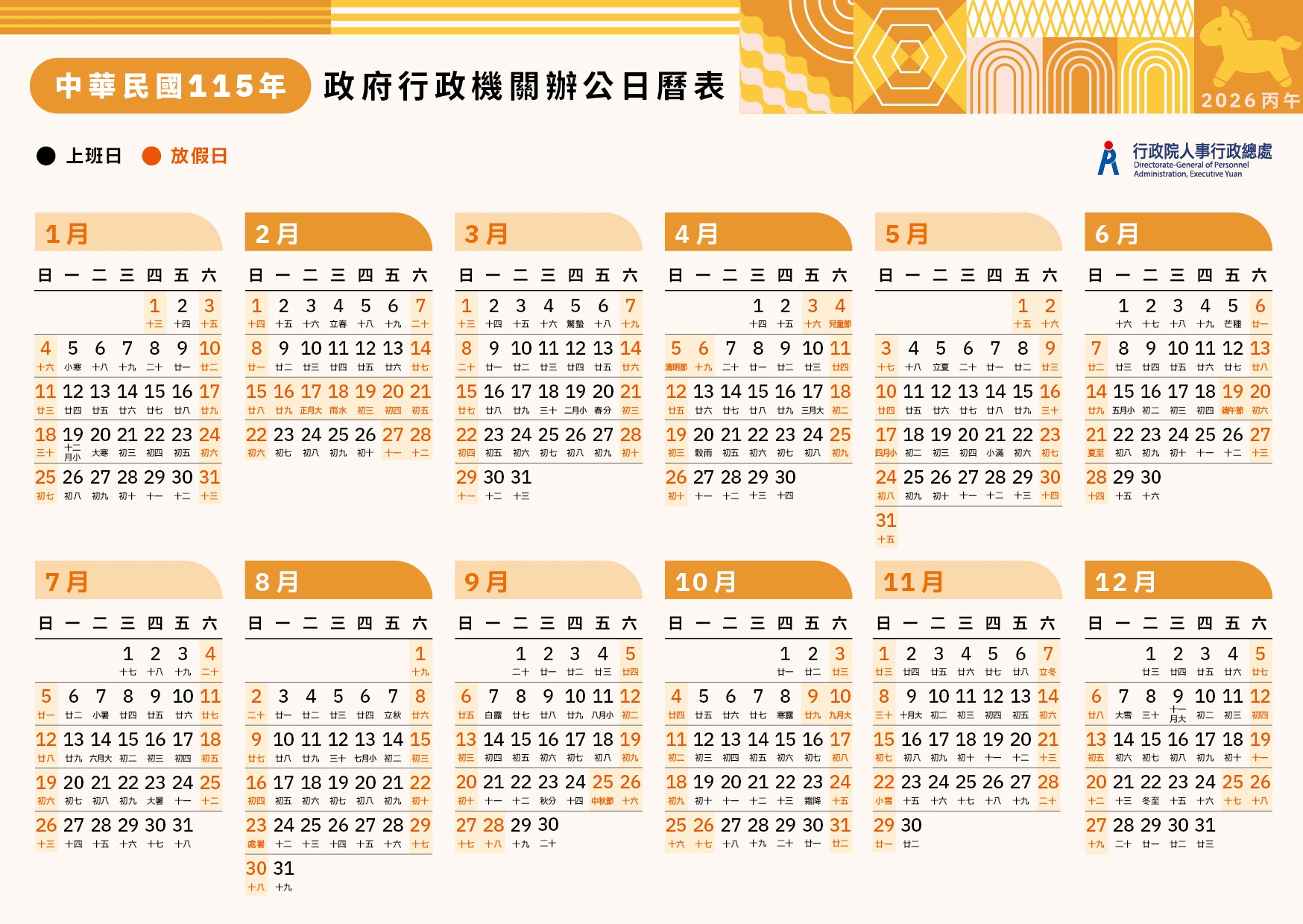 行政院人事行政總處也有提供「115辦公日曆表」多元檔案,供民眾、公務員及各界免費下載。民眾可自行列印下來,劃上自己的請假時間,作為個人月曆或年曆使用。