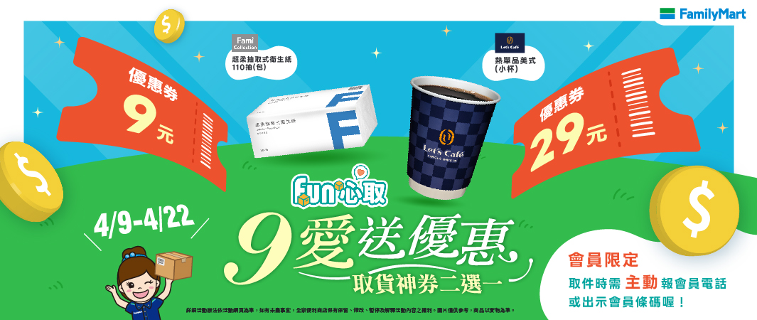 到全家取貨送9元衛生紙優惠券,還有29元咖啡 ! 迎接四月到來,全家開始新取貨優惠,會員取件報電話就送優惠券。想知道活動時間、兌換期限,快到下文了解~