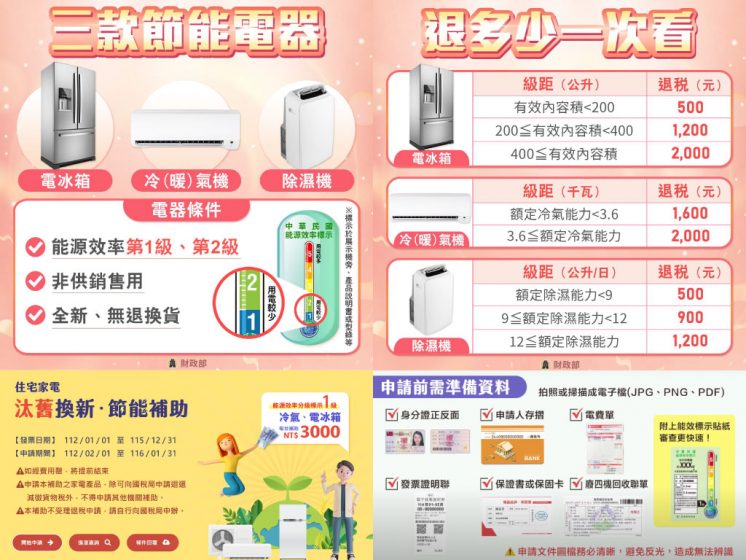 節能家電減徵貨物稅優惠延長至 2029/12/31,購買符合能源效率之冷氣、冰箱、除濕機、暖氣可享退稅補助2000元,打算汰舊換新電器的朋友快把握機會 ! 另外還有住宅家電補助,最高省 5000 元,有關如何線上申請、補助金額、進度查詢,可見下文整理。