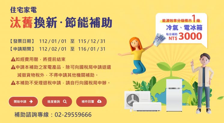 除了上述的新購家電,現在至10 月 31 日前淘汰舊老舊冰箱或冷氣機,並新購一級能效的機型也有補助,每台再補貼 3,000 元 !