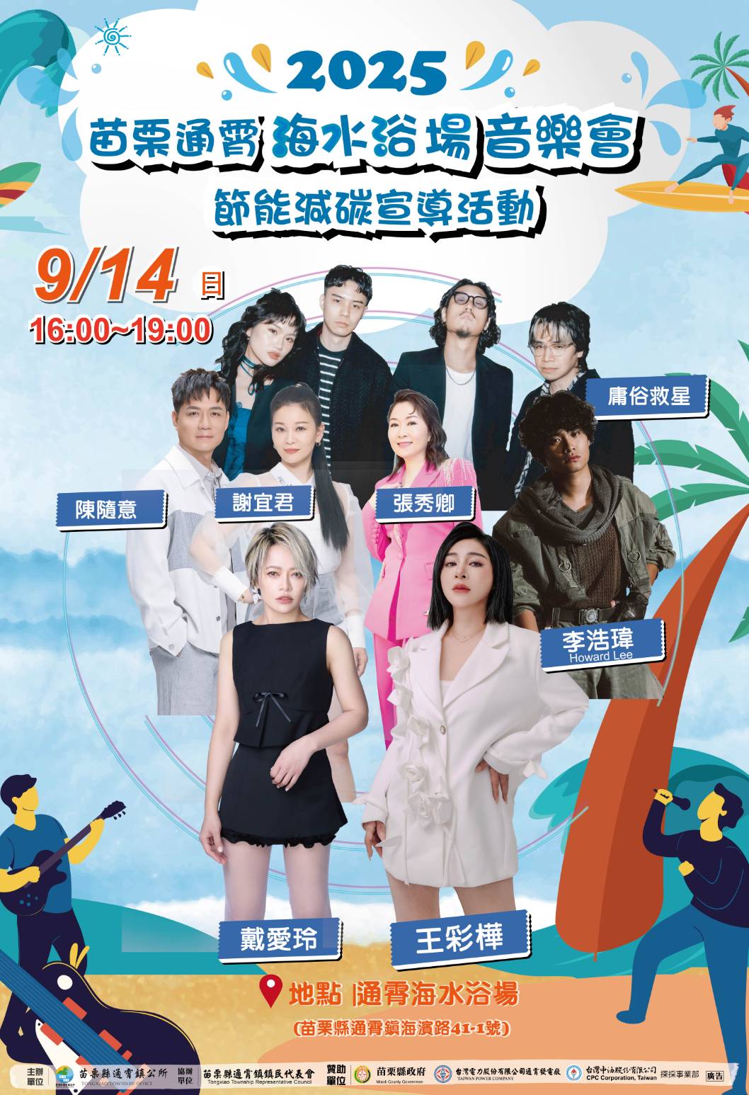 9/14(日)16:00-19:00 將舉辦「通霄海水浴場音樂會」活動,邀請戴愛玲、李浩瑋、庸俗救星、王彩樺、張秀卿、謝宜君、陳隨意等人氣歌手及樂團到場演出,卡司陣容跨世代,集結搖滾、抒情、流行等多元曲風,快來感受超嗨氛圍 !