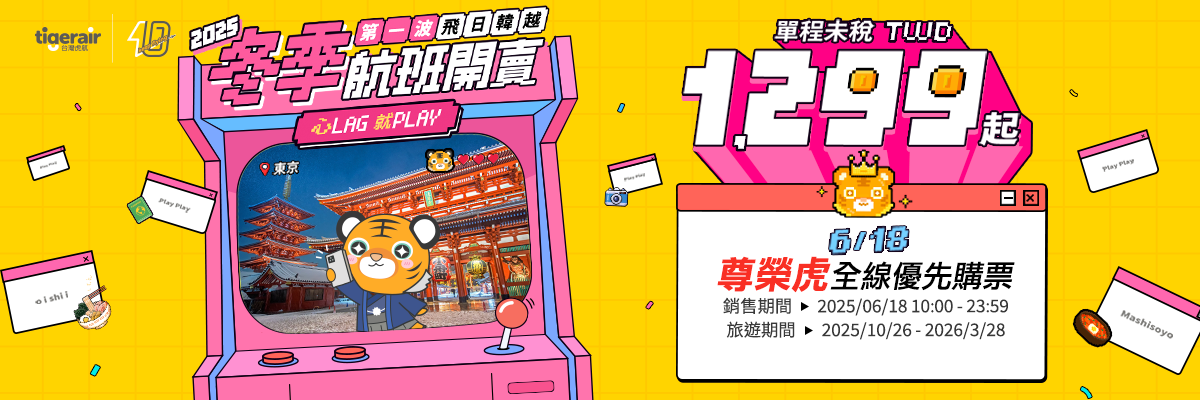 台灣虎航將在 6/18 搶先開賣冬季航班機票,台北到東京 1,799 元起,高雄到沖繩 1,599 元起,台北到仁川 1,299 元起,尊榮虎可於上午 10 點至活動網頁購票。