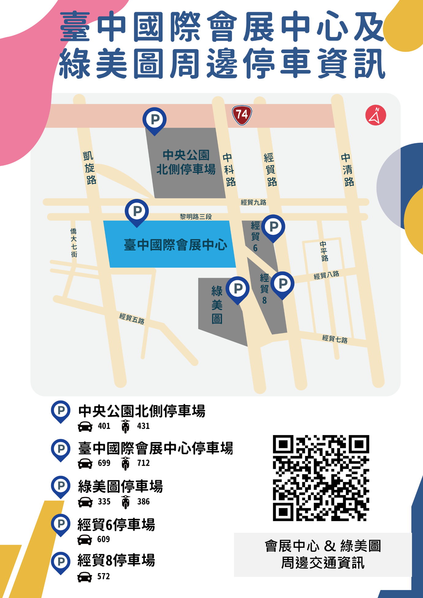 台中綠美圖設有汽車和機車收費停車場,提供 335 個小型車停車位和 386 個機車停車位,開車的朋友可自行前往停放。若都停滿,可參考以下周邊停車場。