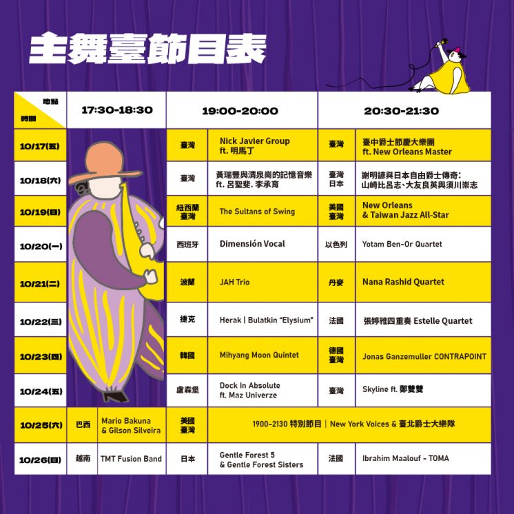 本屆有來自 15 個國家的國際爵士樂團參加,將帶來 Funk、電子樂、爵士搖擺樂等多元曲風,其中還有融入拉丁的創新編曲。特別是這次除了舞台表演、、巡迴場,還有兩場國際級的售票音樂會,同樣不容錯過 !