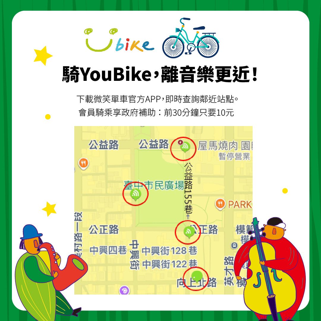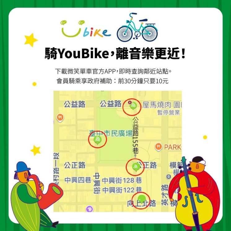 - 轉搭台中公車301、304、305、306、324至「科博館」站下車→ 步行 8 分鐘抵達爵士音樂節。