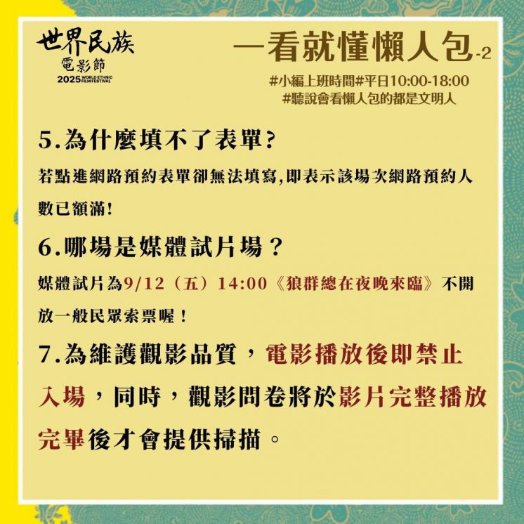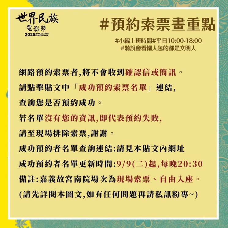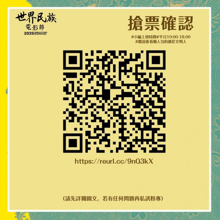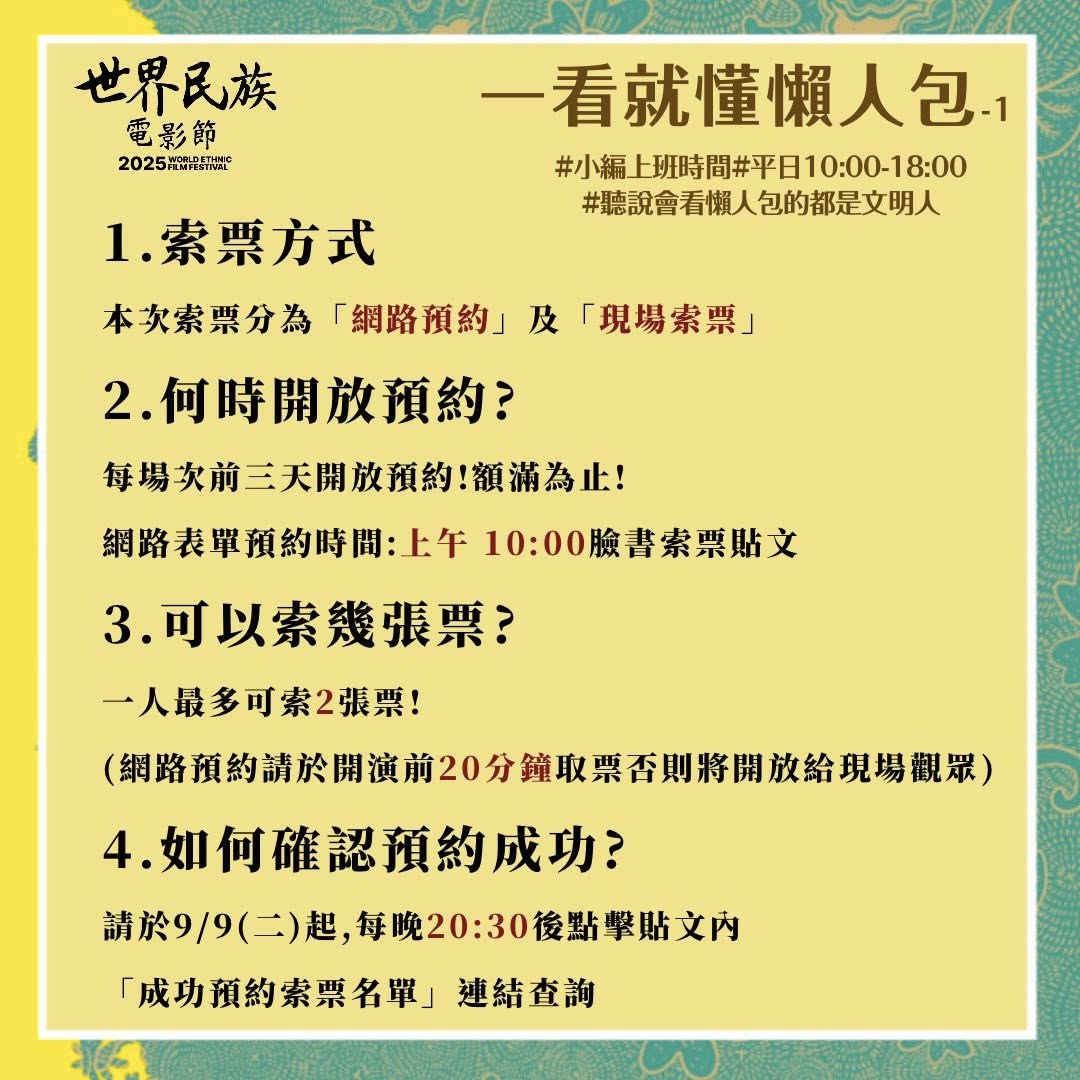 今年世界民族電影節一樣在電影上映日前 3 天早上 10 點開放民眾索票,屆時可至粉專公告的表單填寫資料,取得電影票入場。