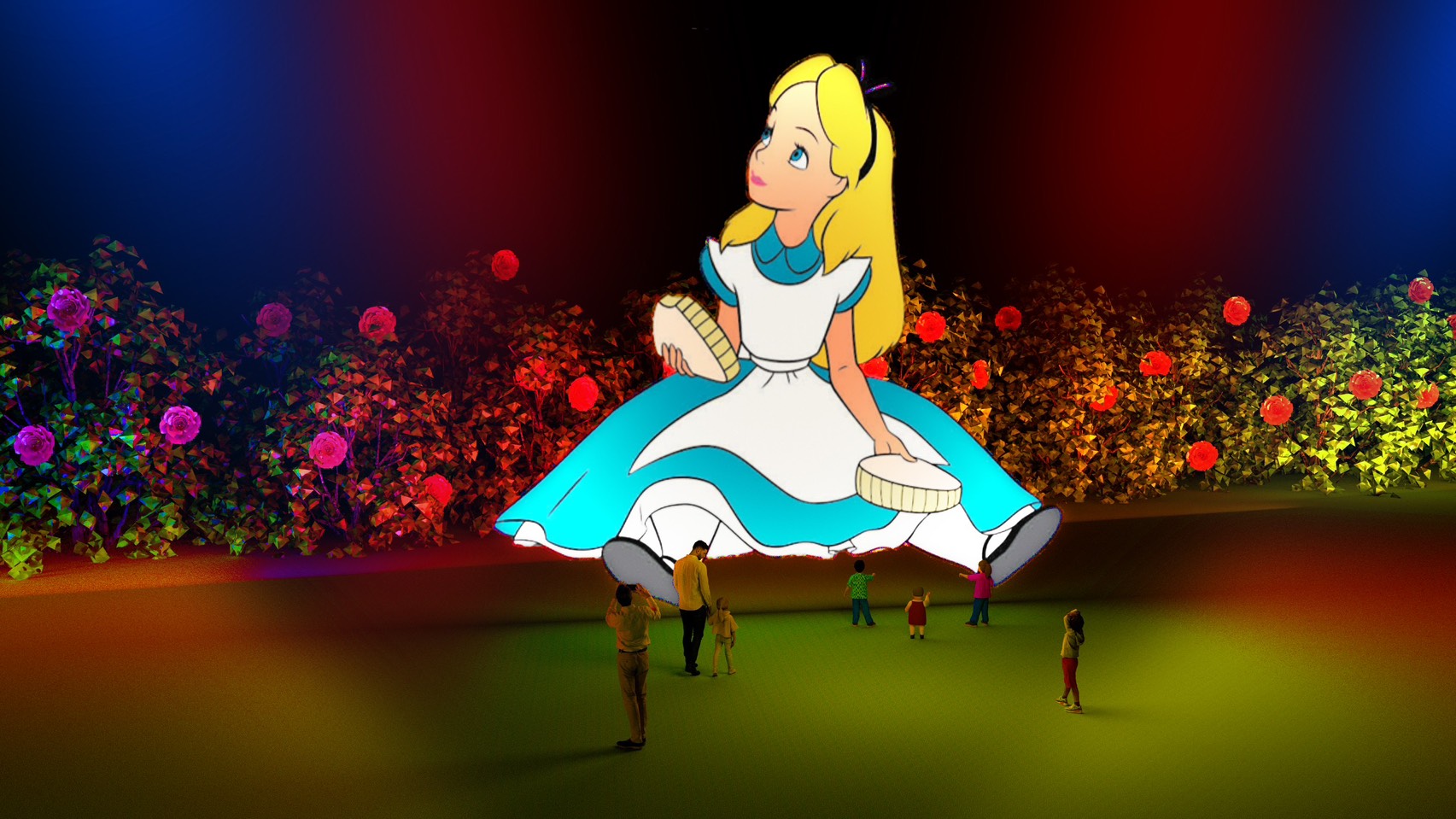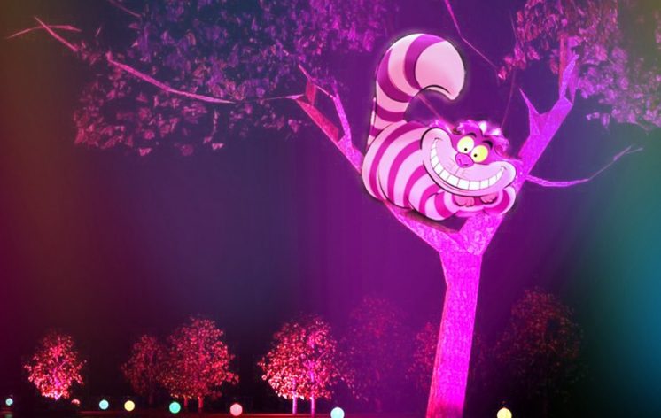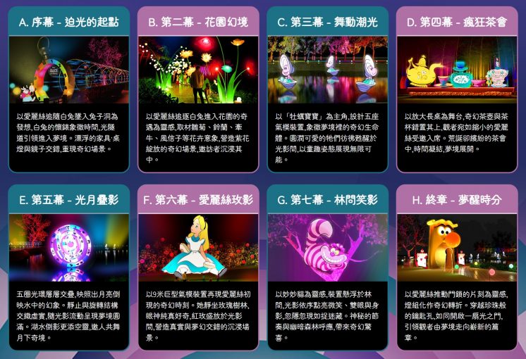 本屆光織影舞再度邀請設計師 Daniel Wong (黃偉豪) 為策展人,以「在光影中探索自己」為展覽核心,在現場打造了 8 座《愛麗絲夢遊仙境》主題裝置藝術,不只可見白兔先生、撲克士兵等故事經典角色,還有 9 公尺高的愛麗絲氣偶和妙妙貓燈箱,要讓大家找回童心。