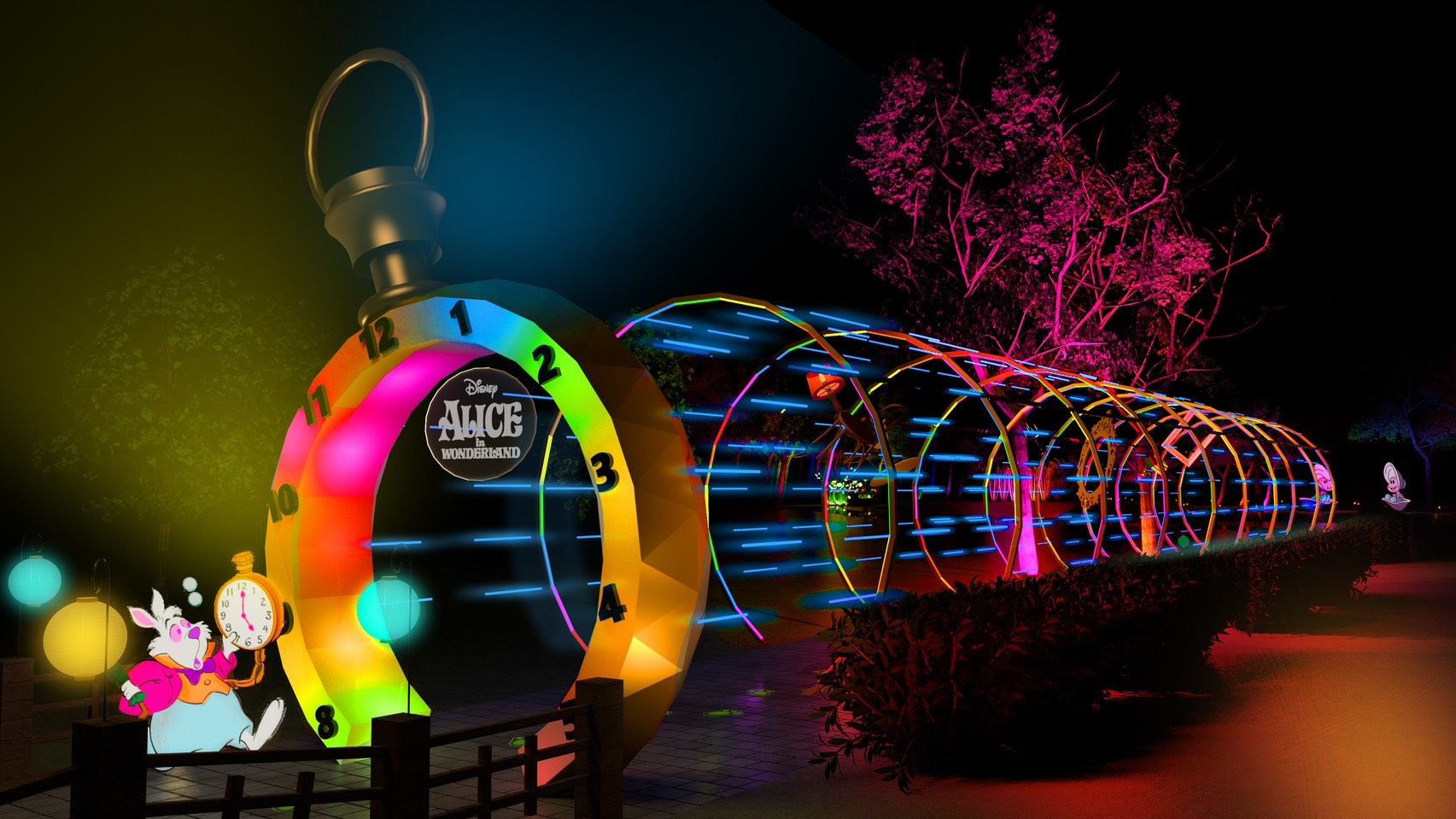 另外還有長 30 公尺的光環隧道,入口為故事裡的白兔懷錶造型,營造一種彷彿能穿越時空的魔幻氛圍。