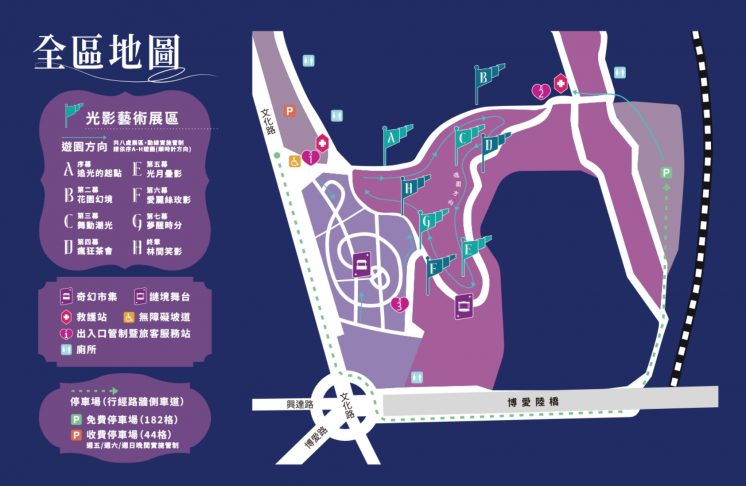 全區地圖如下,現場設有 3 個出入口,從 1 號入口進入可沿著 A 至 H 區繞湖一圈觀賞,市集在近 3 號入口。