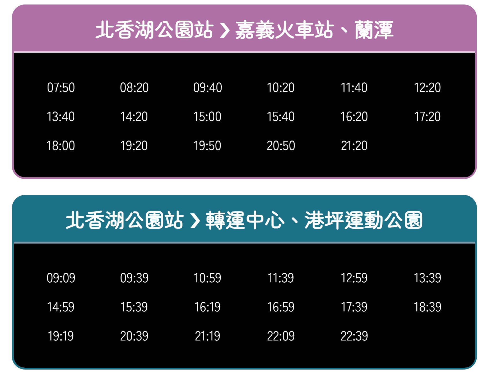 - 搭至「嘉義站」下車 → 在後站(嘉義市轉運中心)轉搭光林我嘉線至「北香湖公園站」→ 抵達光織影舞會場。