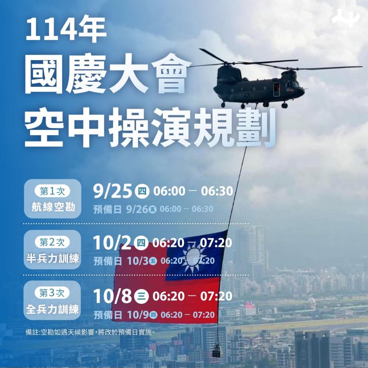 為此將在 9/25 起展開空中操演試航,9/25 進行航線空勘,10/2 進行半兵力訓練,10/8 進行全兵力訓練。