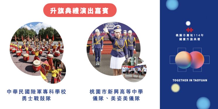 10 月開始,桃園市除了在市府大樓掛上巨幅國旗,也準備在國慶當天舉辦升旗典禮。08:30 開始由陸軍戰鼓隊、桃園市新興高中儀隊與美姿美儀對帶來演出。