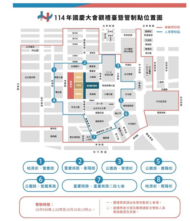 配合國慶大會,總統府周邊將實施管制,範圍包括武昌路、襄陽路、常德街、忠孝西路以南,中華路、博愛路以東,中山南路、林森南路、杭州南路、羅斯福路以西,廣州街、南海路、愛國東路以北。