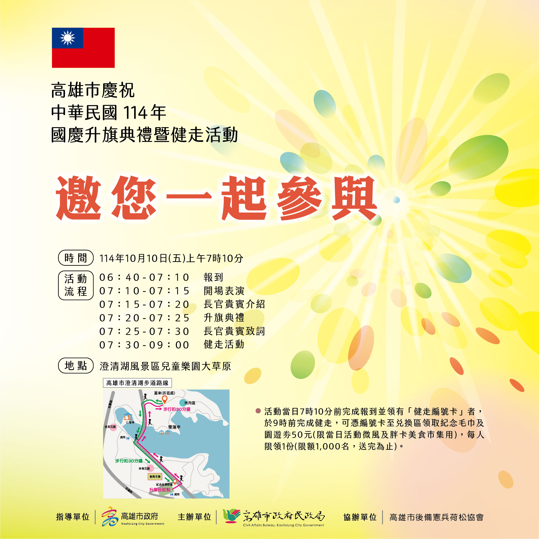 今年高雄市政府準備了 50 元園遊劵,只要到現場參加健走慶祝活動者皆可獲得,1,000 份發完為止 ! 而國慶升旗典禮將由海軍陸戰隊莒拳隊帶來戰技表演,並由海軍官校伴奏,鼎金國小領唱國歌,可以一起來共享盛舉。