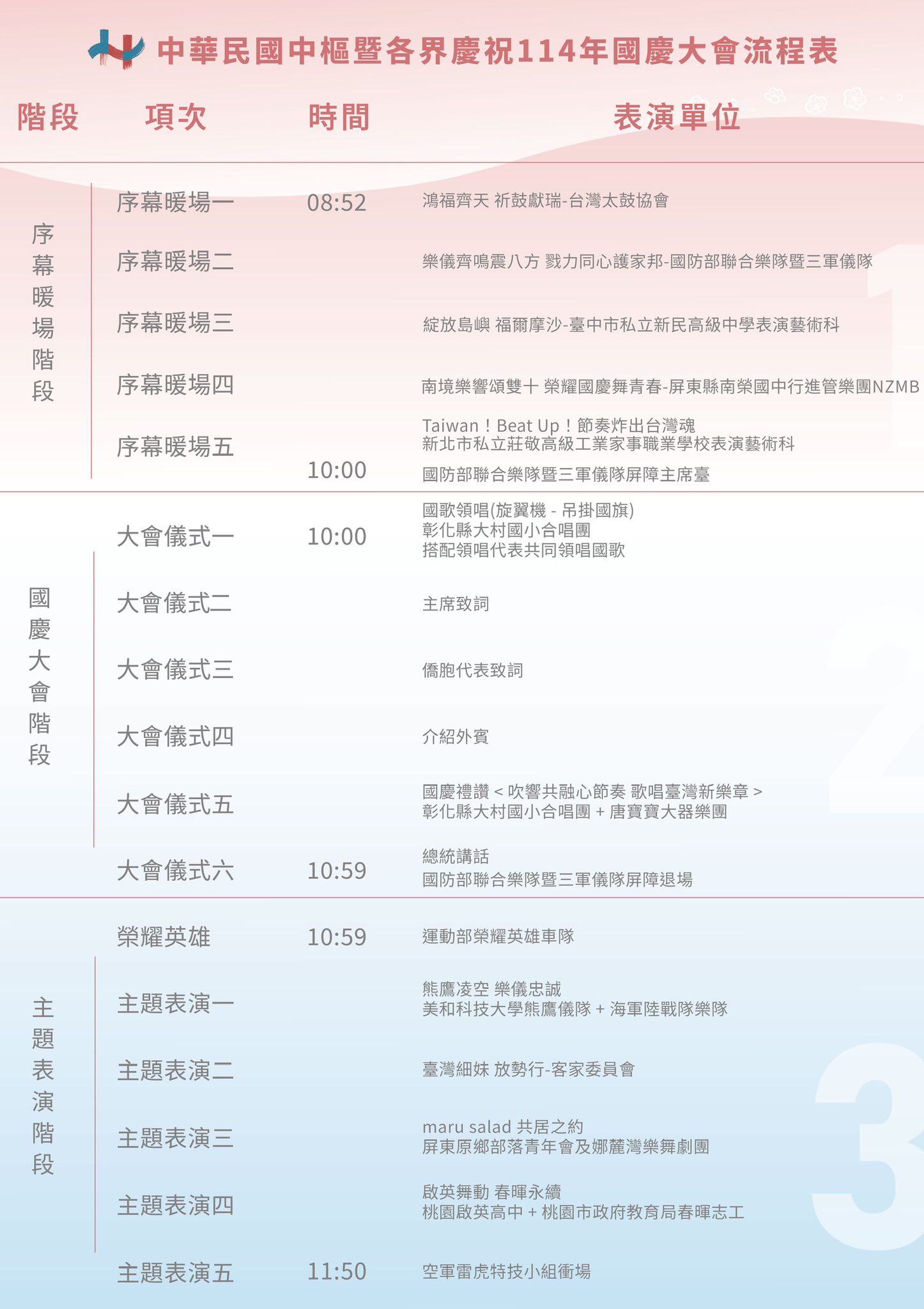 114年國慶大會:觀禮活動、表演、預演時間(2025)