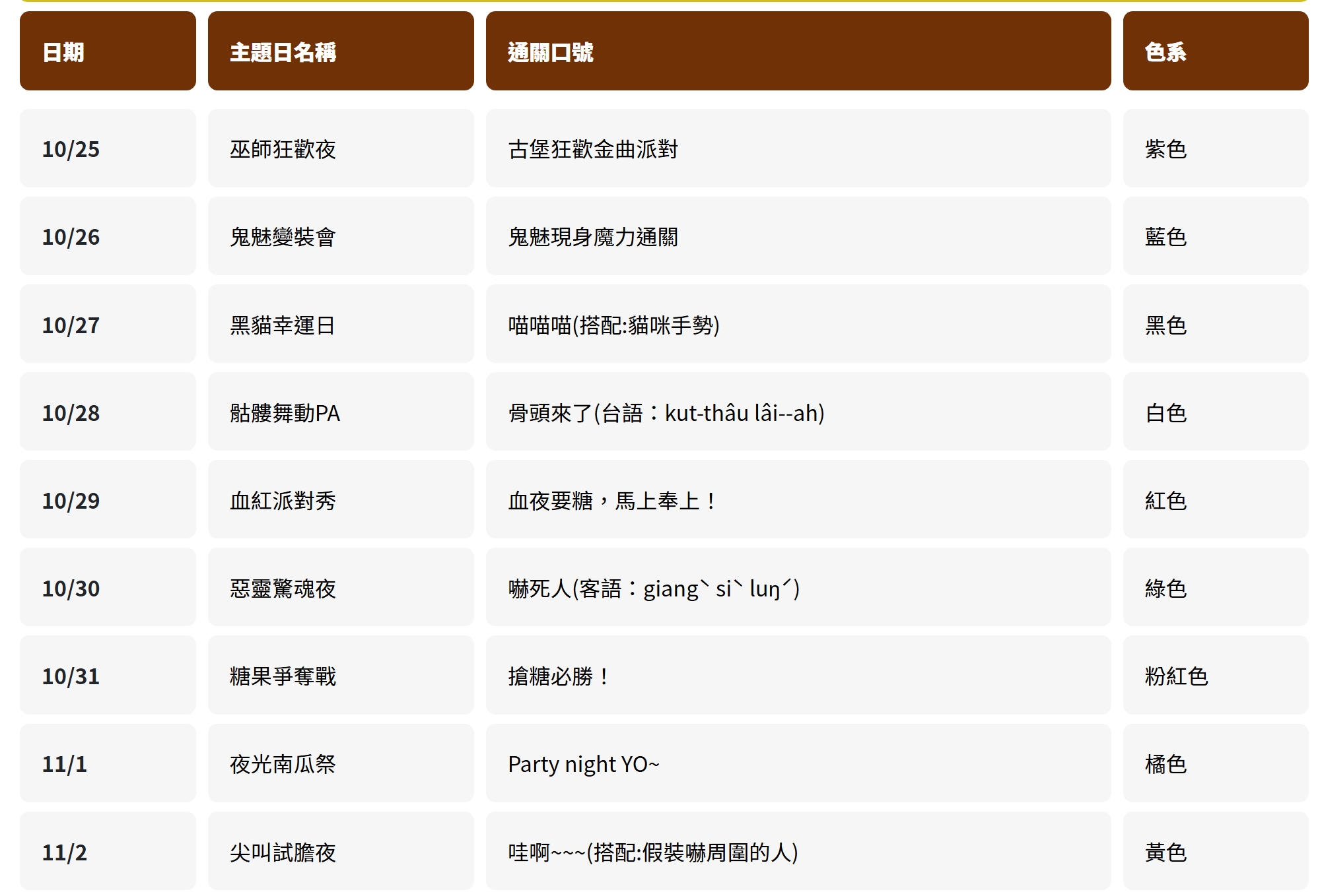 | 假鬼假怪變裝PA 現場提供多種萬聖節服飾、道具供民眾打扮 (可持證件現場登記) | 10/25~11/2 平日17:00-20:00 假日13:00-16:00、17:00-21:00 |