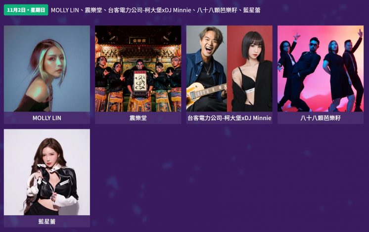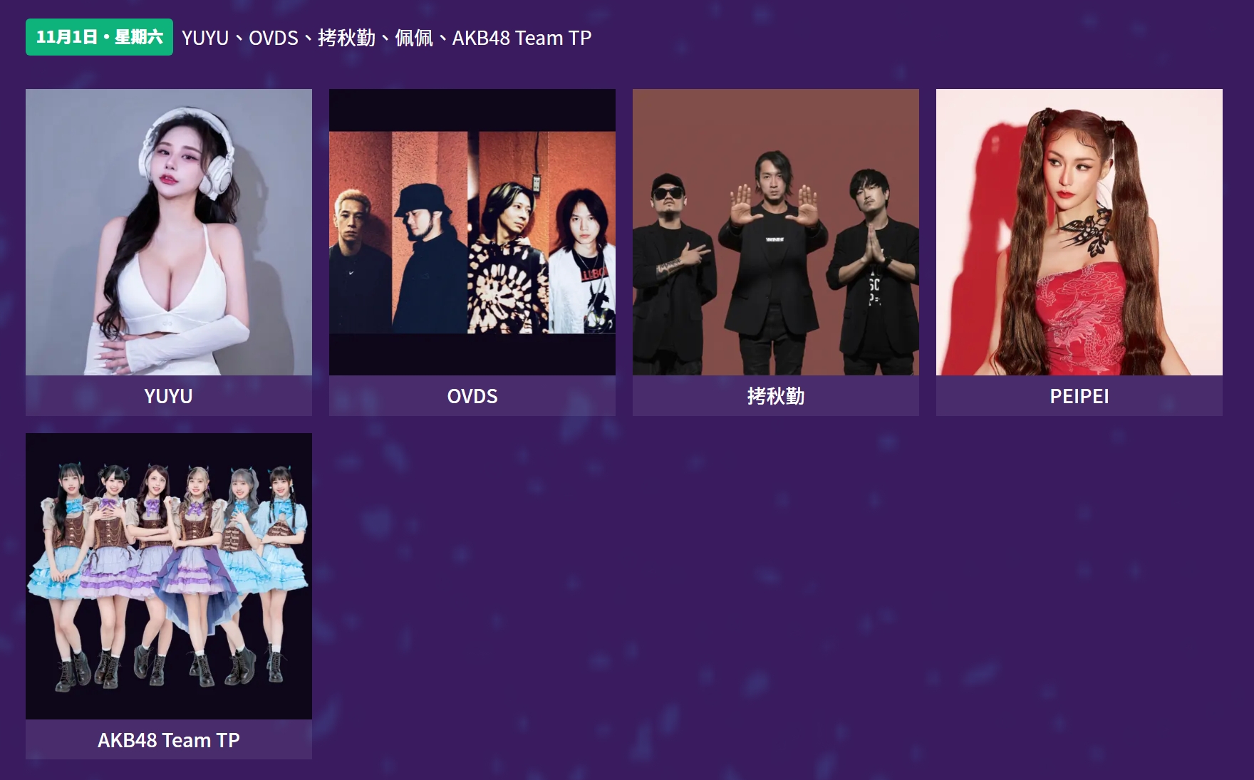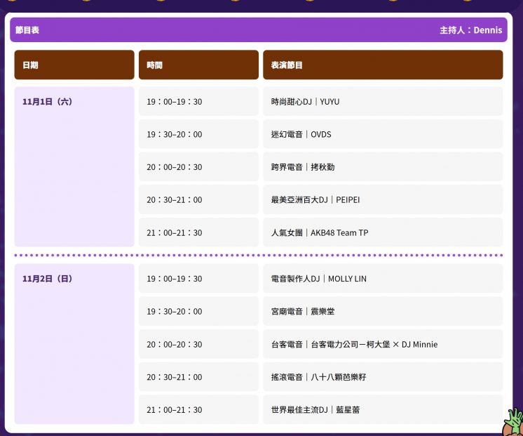 | 變裝電音派對 11/1:YUYU、OVDS、拷秋勤、佩佩、AKB48 Team TP 11/2:MOLLY LIN、震樂堂、台客電力公司-柯大堡xDJ Minnie、八十八顆芭樂籽、藍星蕾 主持人:Dennis 👉詳細資訊 | 11/1、11/2 19:00-21:30 魔幻蜘蛛王舞台 |