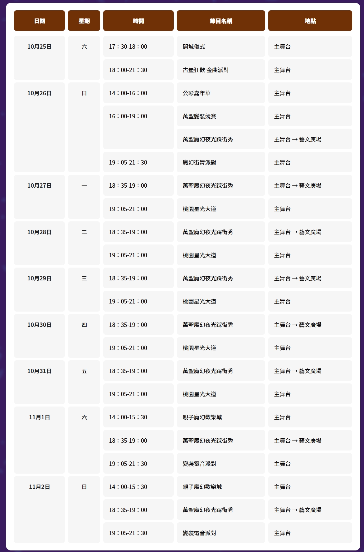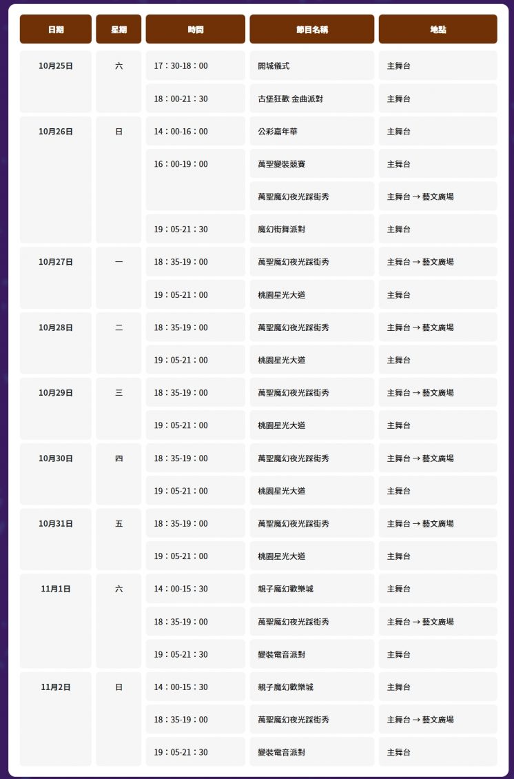 2025 年桃園萬聖城在 10 月 25 日起登場,活動為期 9 天。