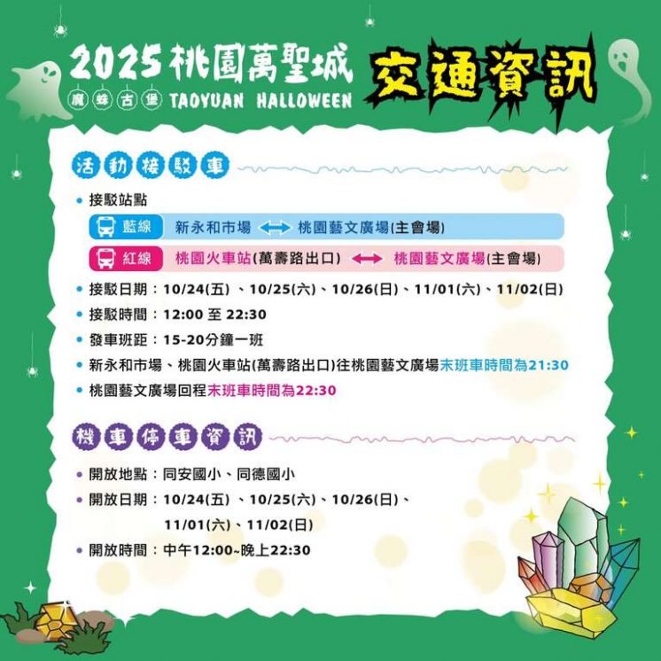 10/24(五)、10/25(六)、10/26(日)、11/1(日)、11/2(日)假日期間有接駁車,大家可以在 12:00-22:30 在新永和市場、桃園火車站萬壽路出口搭車,抵達會場。末班車在 21:30 發車,藝文廣場回程最後一班在 22:30。