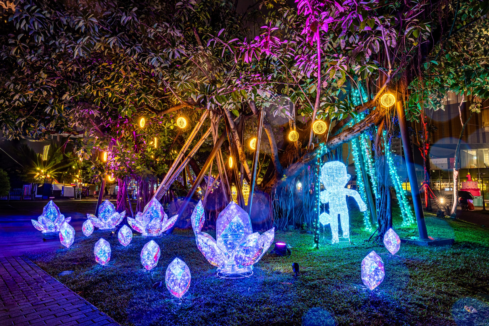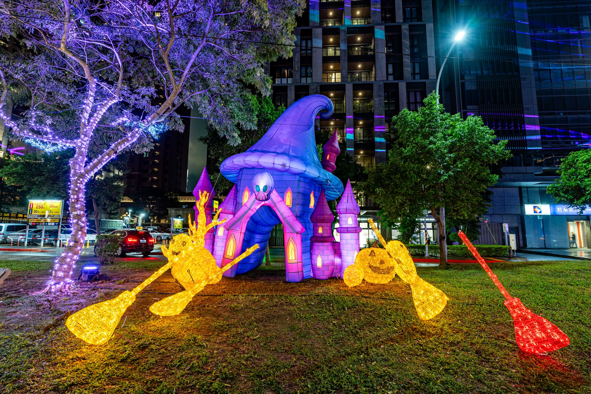 今年有 12 座萬聖節主題裝置藝術,以藝文廣場「萬聖魔幻城堡」的守護者「魔幻蜘蛛王」為核心,向外延伸出 3 處魔域——「萬聖夜總會」「鬼吹燈迷宮」、「盤絲光纖樹」,並由「孟婆奈何橋」、「魔神照妖鏡」、「詭異盤絲洞」串聯。