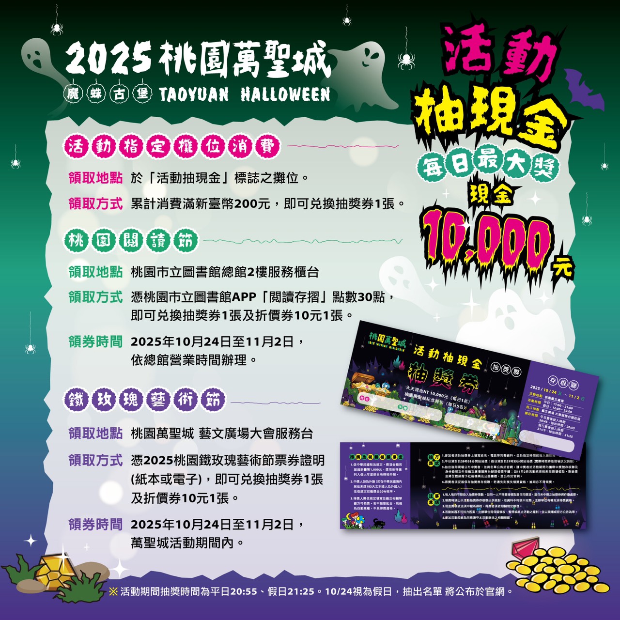 | 抽現金、萬聖城紀念背包 符合以下條件者可參加: 1. 至有「發現金」標誌的攤位消費滿200元 2. 憑桃園市立圖書館APP-閱讀存摺 30 點,可至總館 2 樓換抽獎券 3.憑鐵玫瑰藝術節票券,至萬聖城服務台 | 10/24~11/2 平日17:00-21:00 假日12:00-22:00 藝文廣場-大會服務台摸彩箱 |
