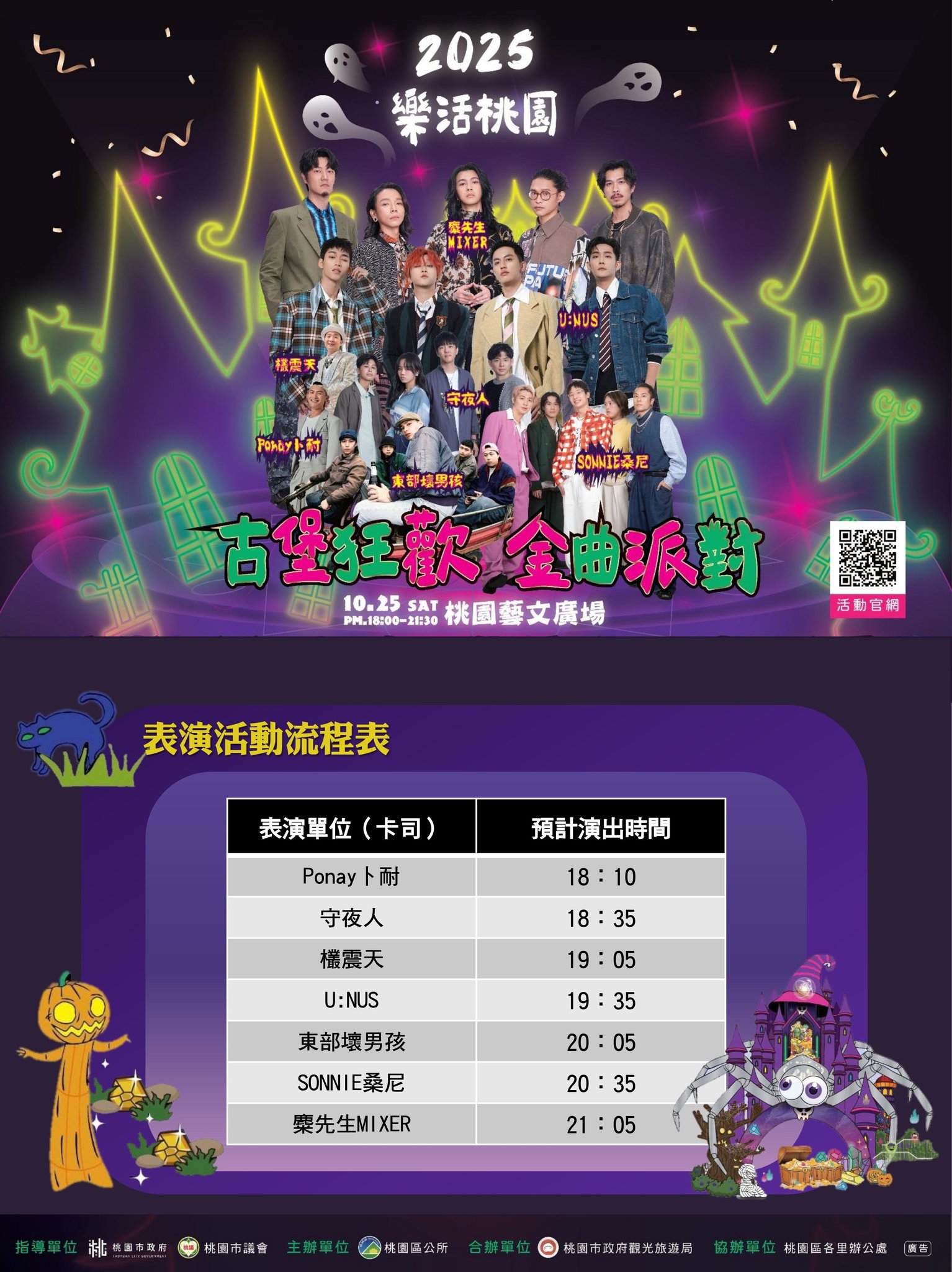 今年桃園萬聖城「古堡狂歡 金曲派對」演唱會將在 10/25(六)18:00-21:00 登場,卡司有麋先生、U:NUS、守夜人、Ponay卜耐、欉震天、SONNIE桑尼、東部壞男孩,共有 7 組演出歌手及樂團。