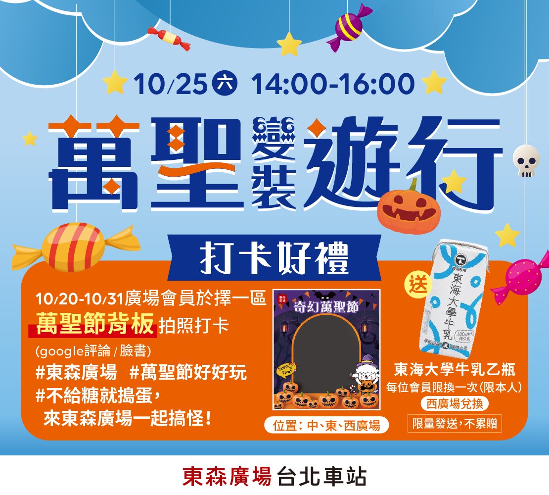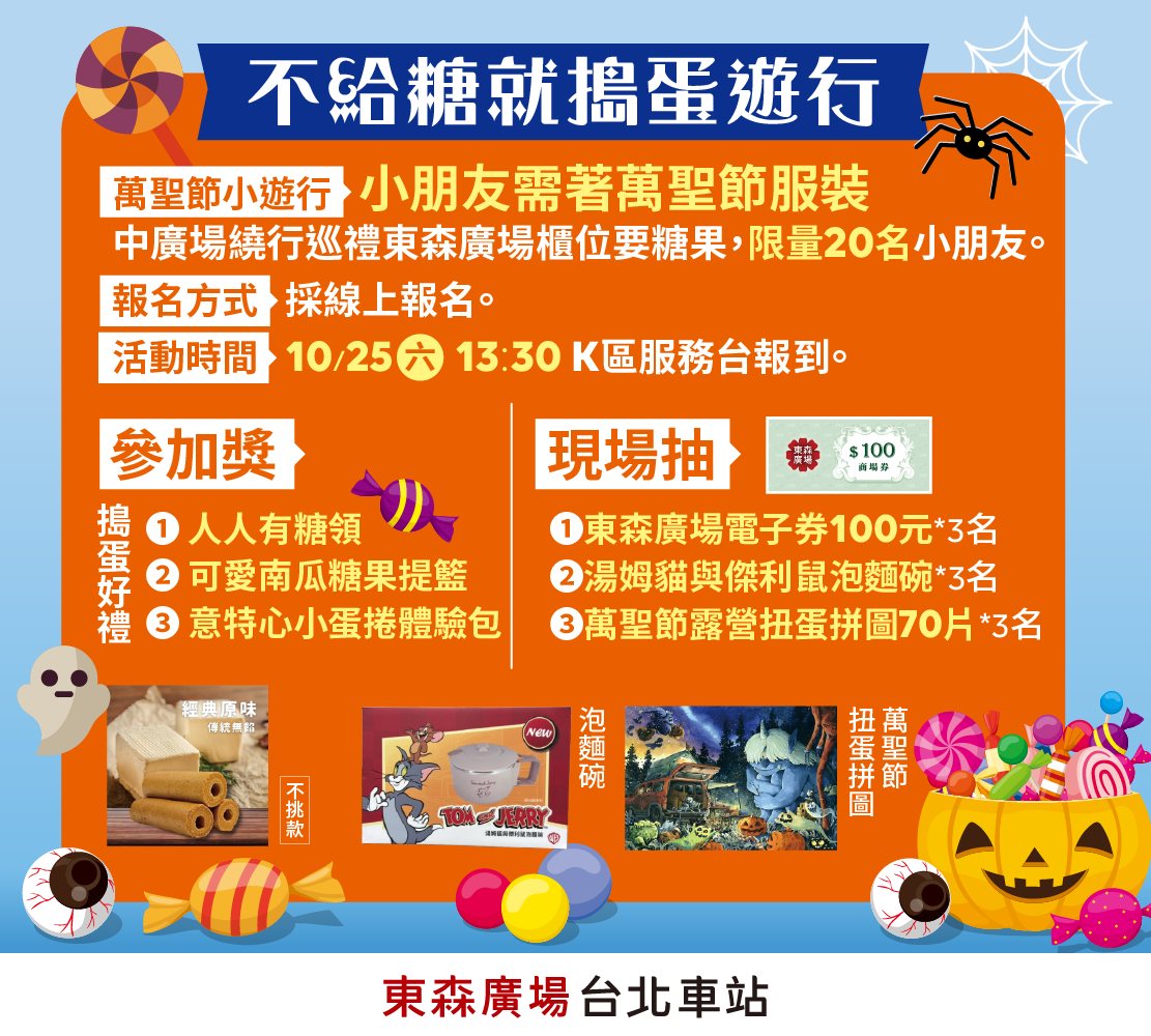 台北車站東森廣場將在 10 月 25 日舉辦不給糖就搗蛋遊行活動,參加的小朋友可領取糖果、南瓜提籃和小蛋捲,換上萬聖節服裝即可參加 ! 另外現場還有抽獎,可抽 100 元電子券和拼圖。