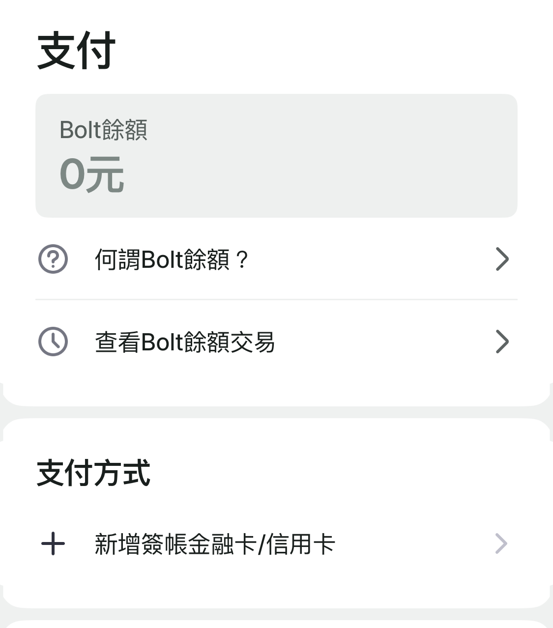 如果有在其他地區使用 Bolt,餘額低於 0 元,可透過 JCB、Master Card、Visa、PayPal、iDeal、M-Pesa、Bancontact、American Express、Diners Club等儲值。