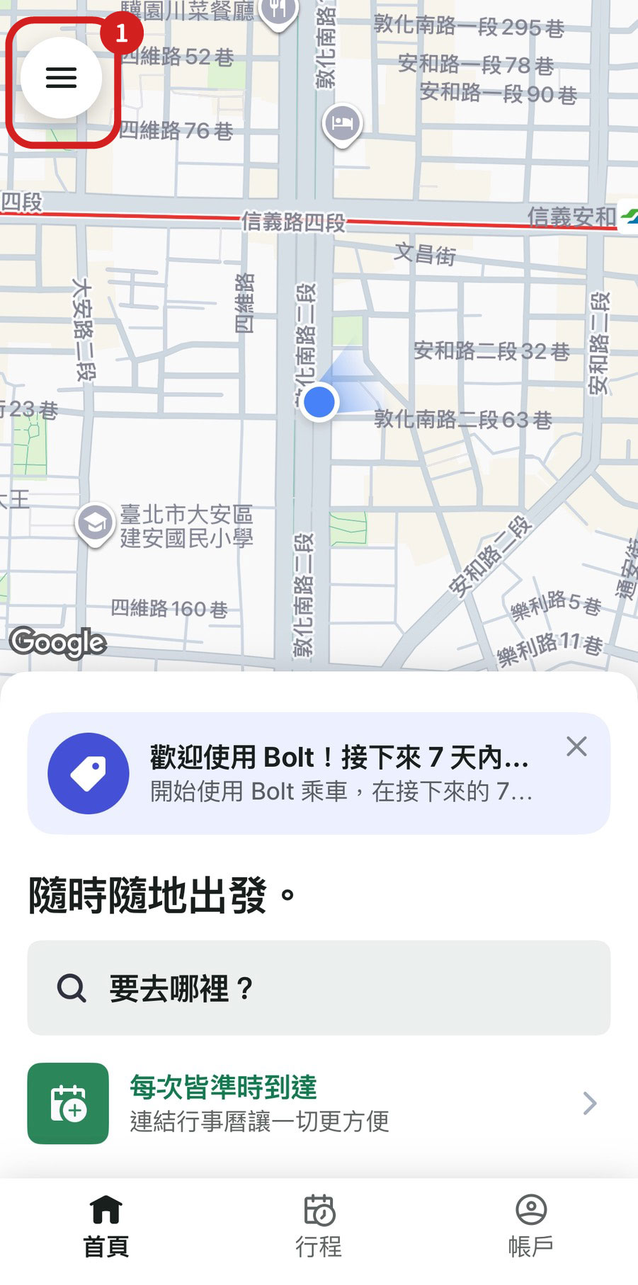 - Step1:進入 Bolt APP,點選左上選單圖示
