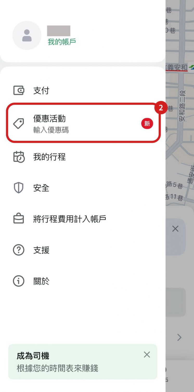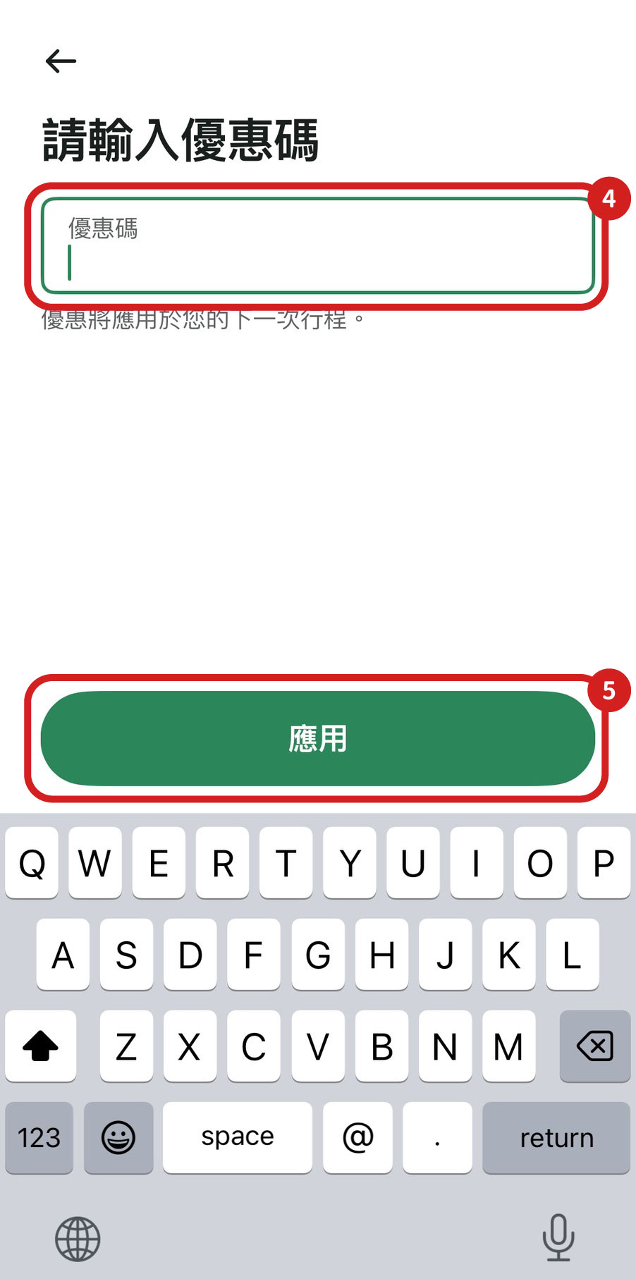 優惠碼可直接在 APP 中輸入使用。輸入代碼後即可取得優惠券,點選「應用」即享有乘車折抵。