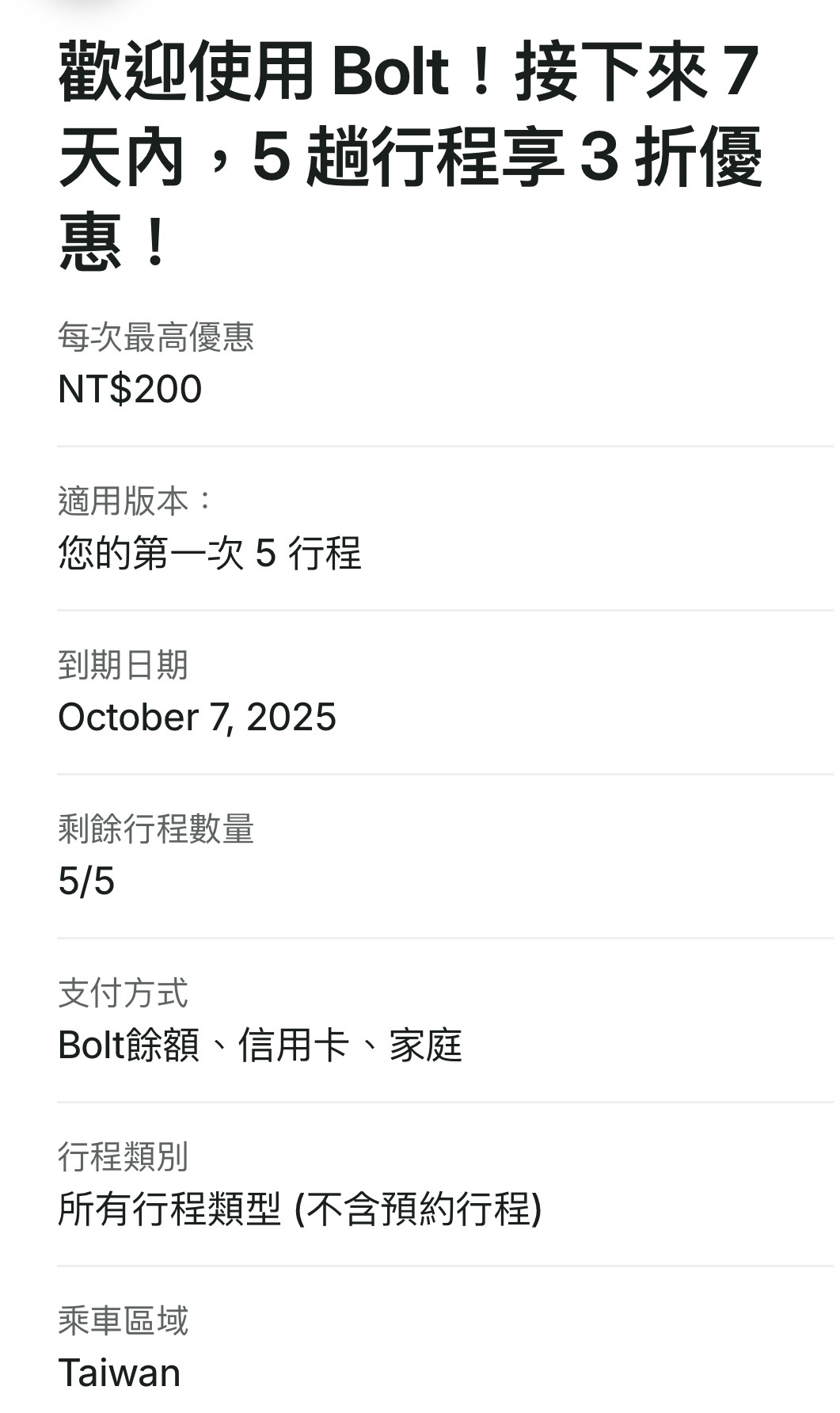 2025/9/23起,註冊成為 Bolt 會員,即可享 7 天內 3 折乘車優惠,共 5 次,最高可折 200 元;7 天內 6 折行程優惠,共 5 趟。 - 新戶乘車優惠