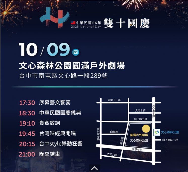 2025 年國慶晚會在 10 月 9 日文心森林公園圓滿戶外劇場舉行,卡司有白冰冰、胡瓜、陽帆、葉璦菱、羅文裕、舞思愛、阿逗仔樂團、葉恩琦、九天民俗技藝團、震樂堂、台灣特技團、戊己劇團、台中市交響樂團、青年高中表藝科、台中少年兒童合唱團,並由血肉果汁機、玖壹壹擔綱壓軸。