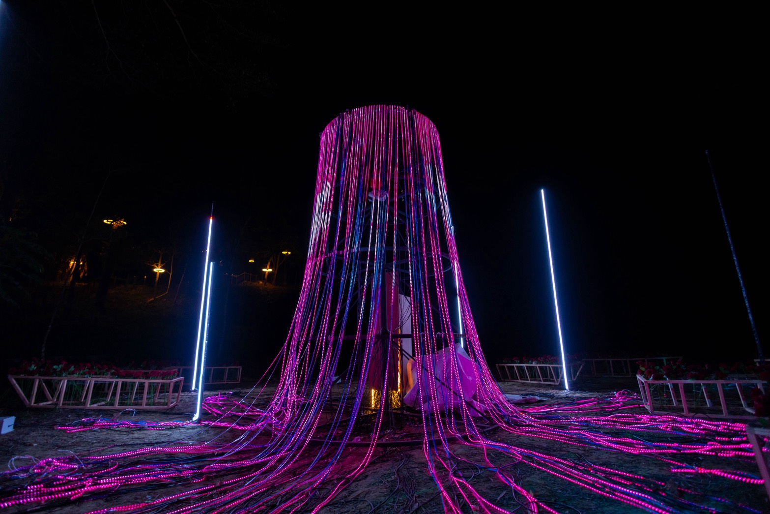 《聲波花》是一座互動裝置藝術,由擅長運用跨界媒材創作的陳普所作。當民眾靠近時,周圍的花瓣將緩緩綻開,散發著光芒,創造神秘魔幻的氛圍,為這次空山祭必看的作品。