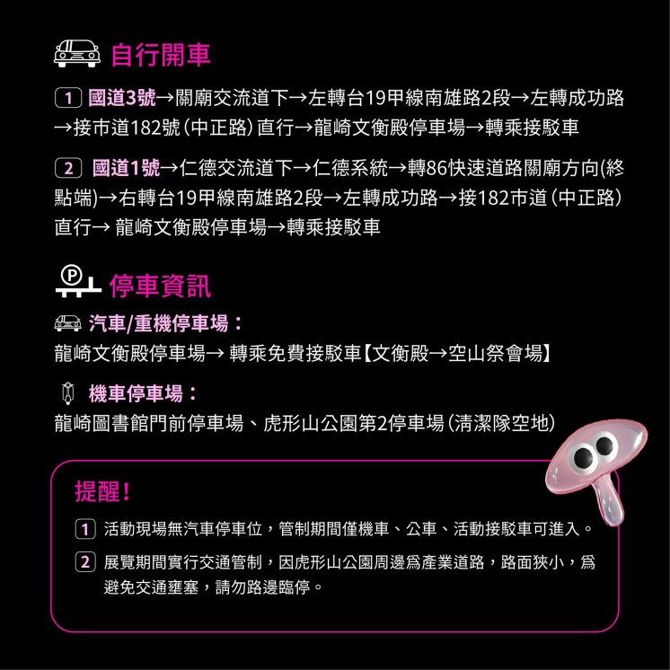 2. 國道一號:仁德系統 → 轉86快速道路 → 關廟方向 → 右轉南雄路二段 → 左轉成功路 → 182縣道 → 龍崎文衡殿停車場 → 轉搭接駁車 → 抵達空山祭。
