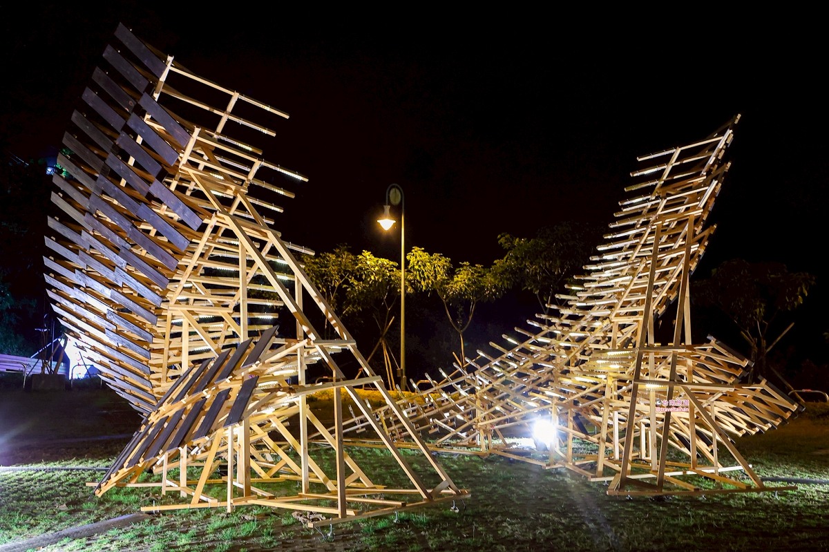 印尼藝術家 Aji Prasetyo 將兩週在龍崎駐村的經驗,化作蜻蜓造型動態裝置《動能變異》。藉由在夜裡閃著「警示光」,引領觀者思考生態與環境議。