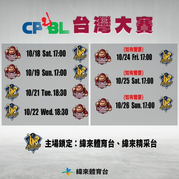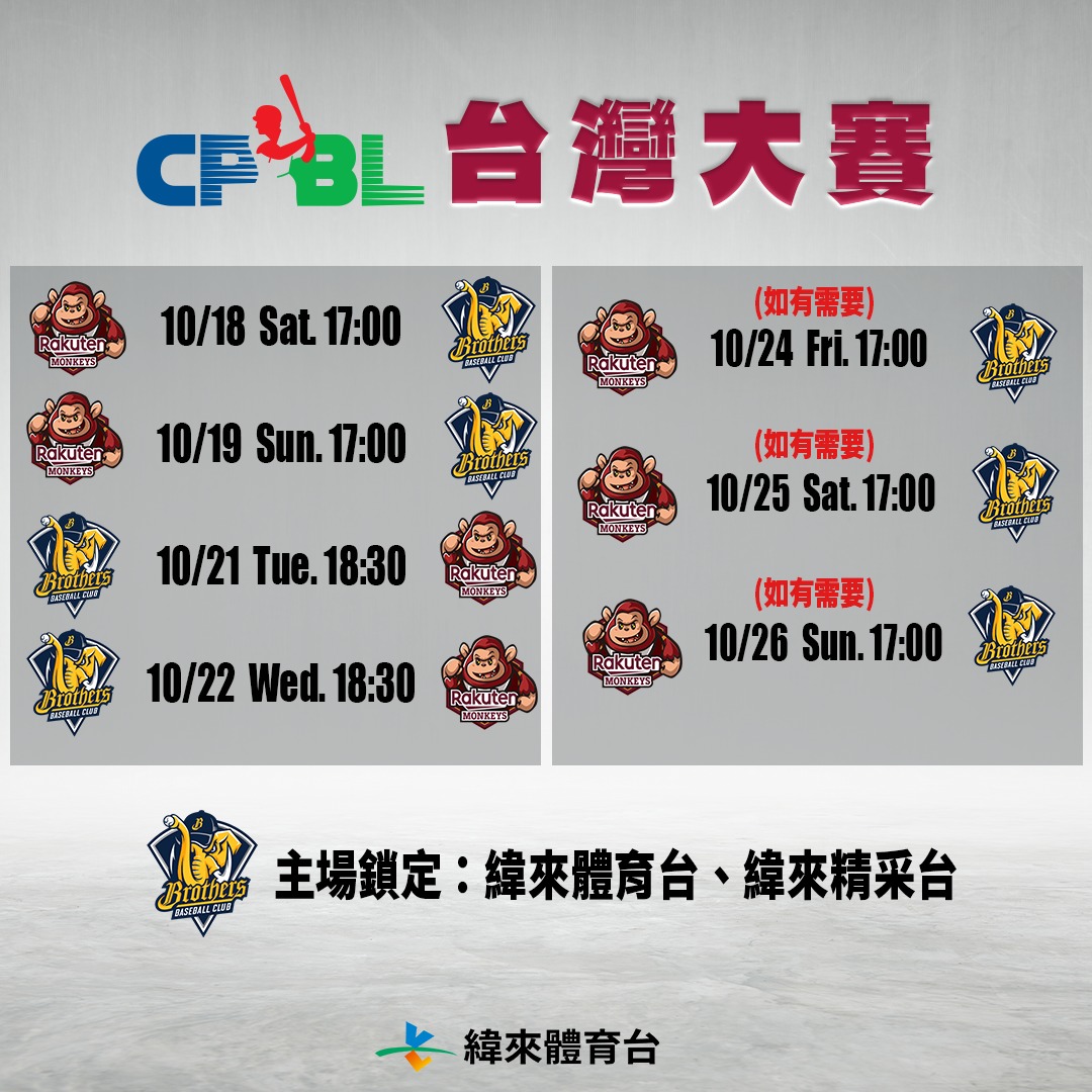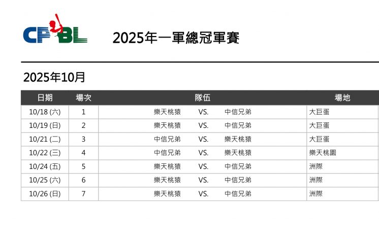 • 2025中華職棒總冠軍賽時間:10/18起,最遲於10/26結束