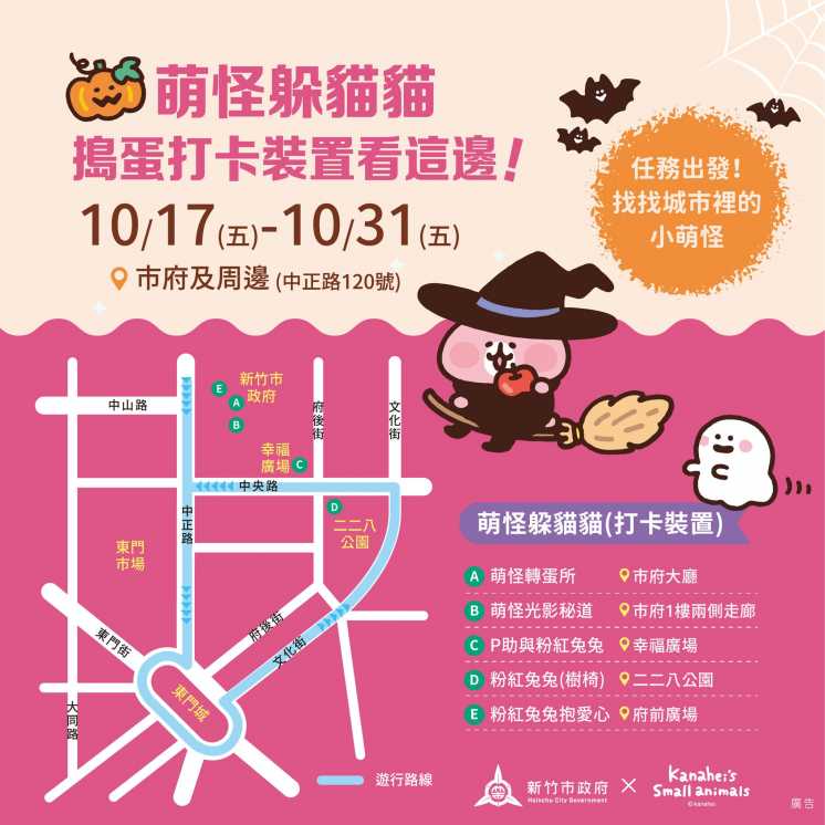 今年有 5 個可愛卡娜赫拉粉紅兔兔與P助萌怪裝置,在新竹市市府大廳、幸福廣場和二二八公園草皮展出,要以療癒角色打造童趣世界,另外還有期間限定「光影秘道」,可以來感受奇幻的萬聖節氣氛。