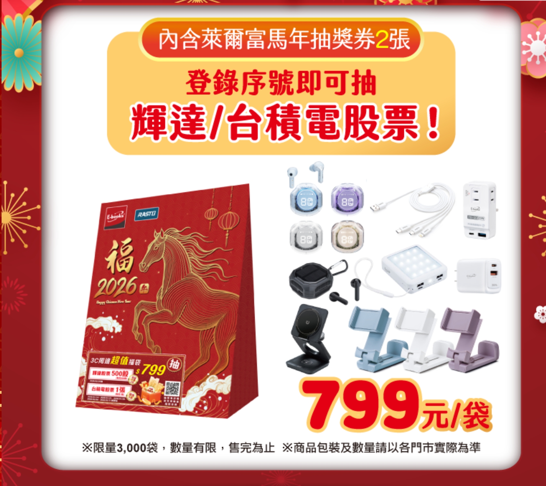 除了馬年福袋、發財卡,萊爾富也同步推出「資訊3C福袋」,迎接 2026 春節 ! 每袋 799 元,內容物有價值 799 元以上的 3C 商品組合和抽獎券 1 張。全台限量 3,000 包,售完為止。