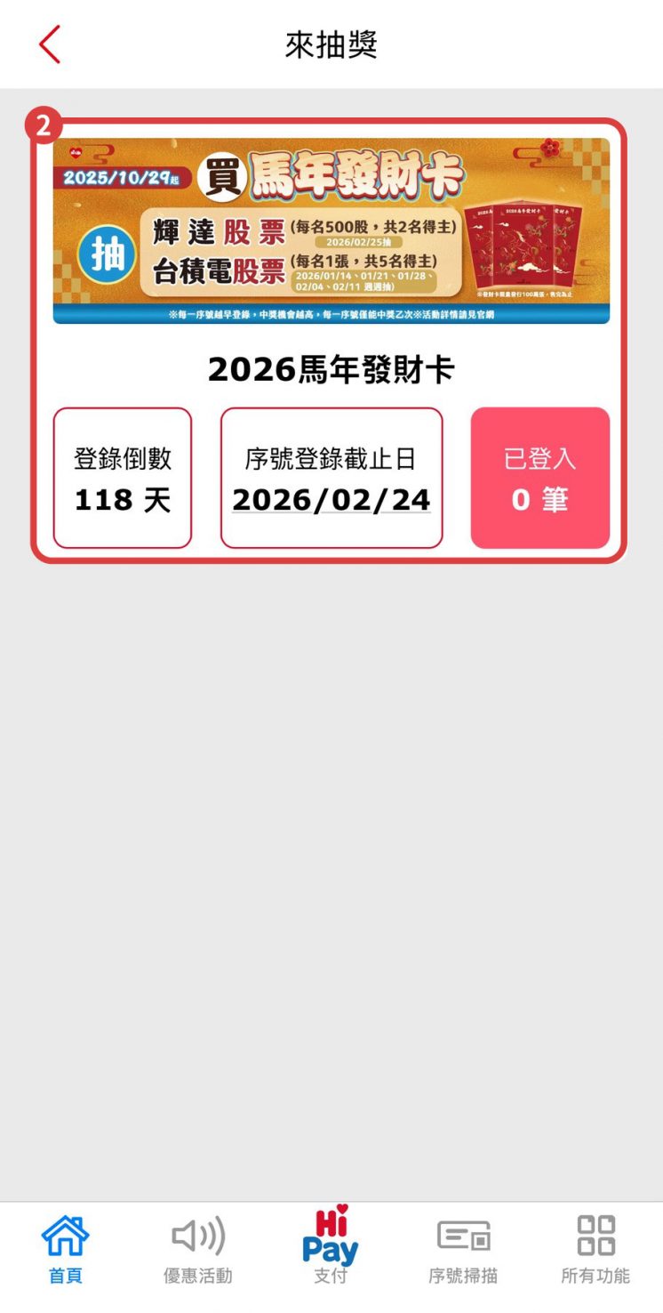 | 馬年發財卡 | 100元 | 2025/10/29(二)~2026/2/22(日) | 10萬包 |