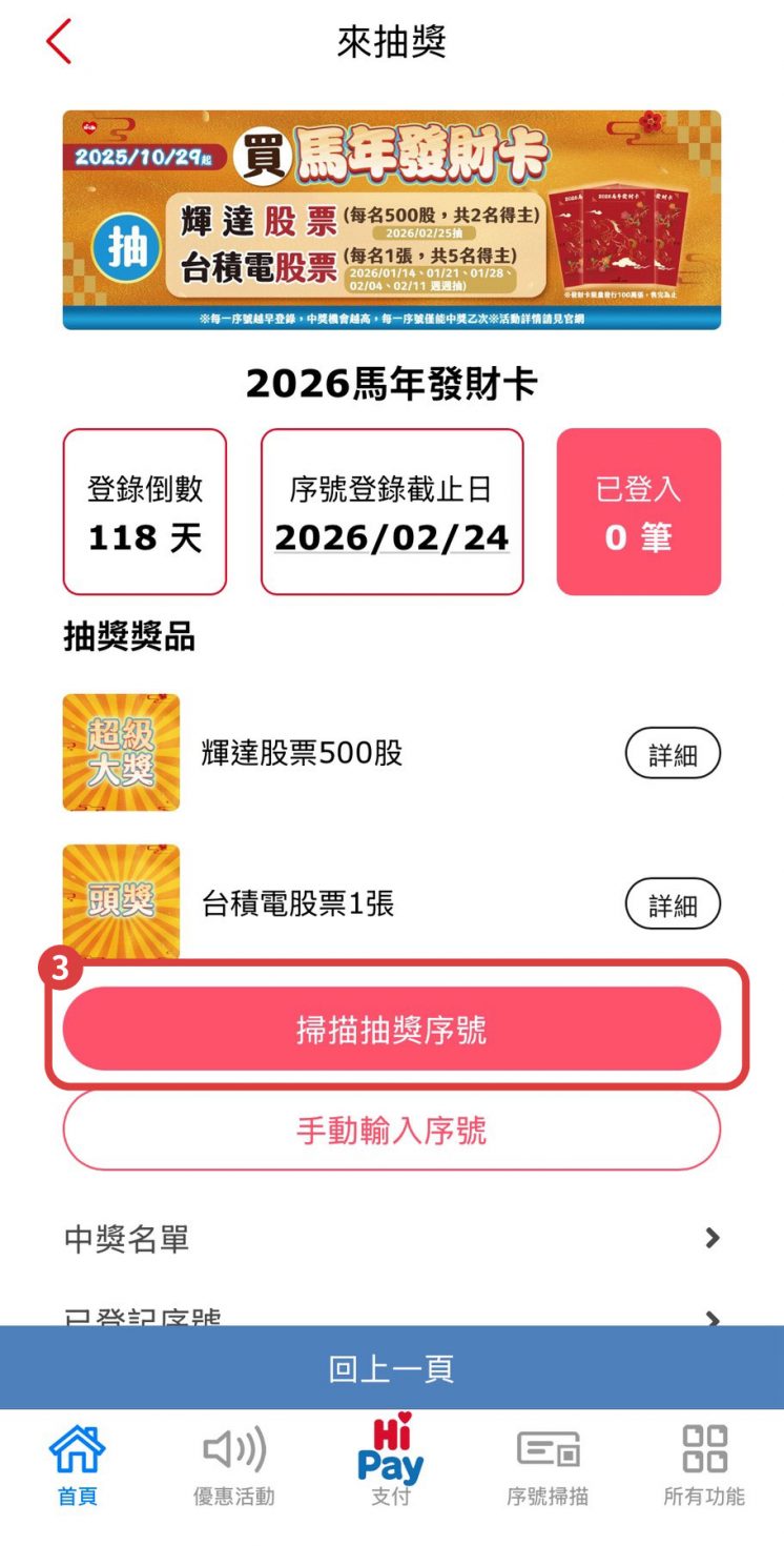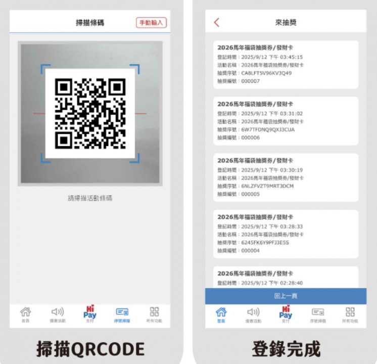 登錄方式也非常簡單,開啟萊爾富 Hi-Life VIP APP,點選「來抽獎」>「2026馬年發財卡」>「掃描輸抽獎序號」,掃描活動條碼 QR Code,即可完成萊爾富福袋登錄。