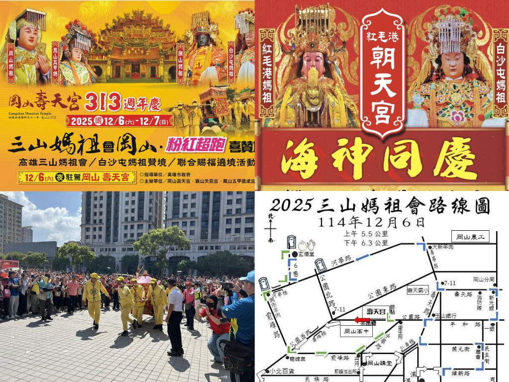 這次不僅鳳山五甲媽、旗山媽、岡山媽皆會參與,是難得一見的「高雄三山媽祖會」,白沙屯媽祖也特地南下共襄盛舉,為四媽祖相聚盛事 !