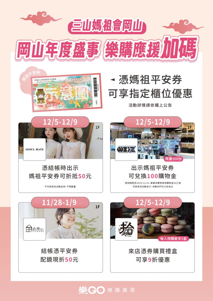 配合這次媽祖遶境活動,高雄市政府也將發放 50 元面額的「媽祖平安券」,憑券可至白沙屯媽祖贊境活動攤位和岡山合作店家使用,折抵消費金額。