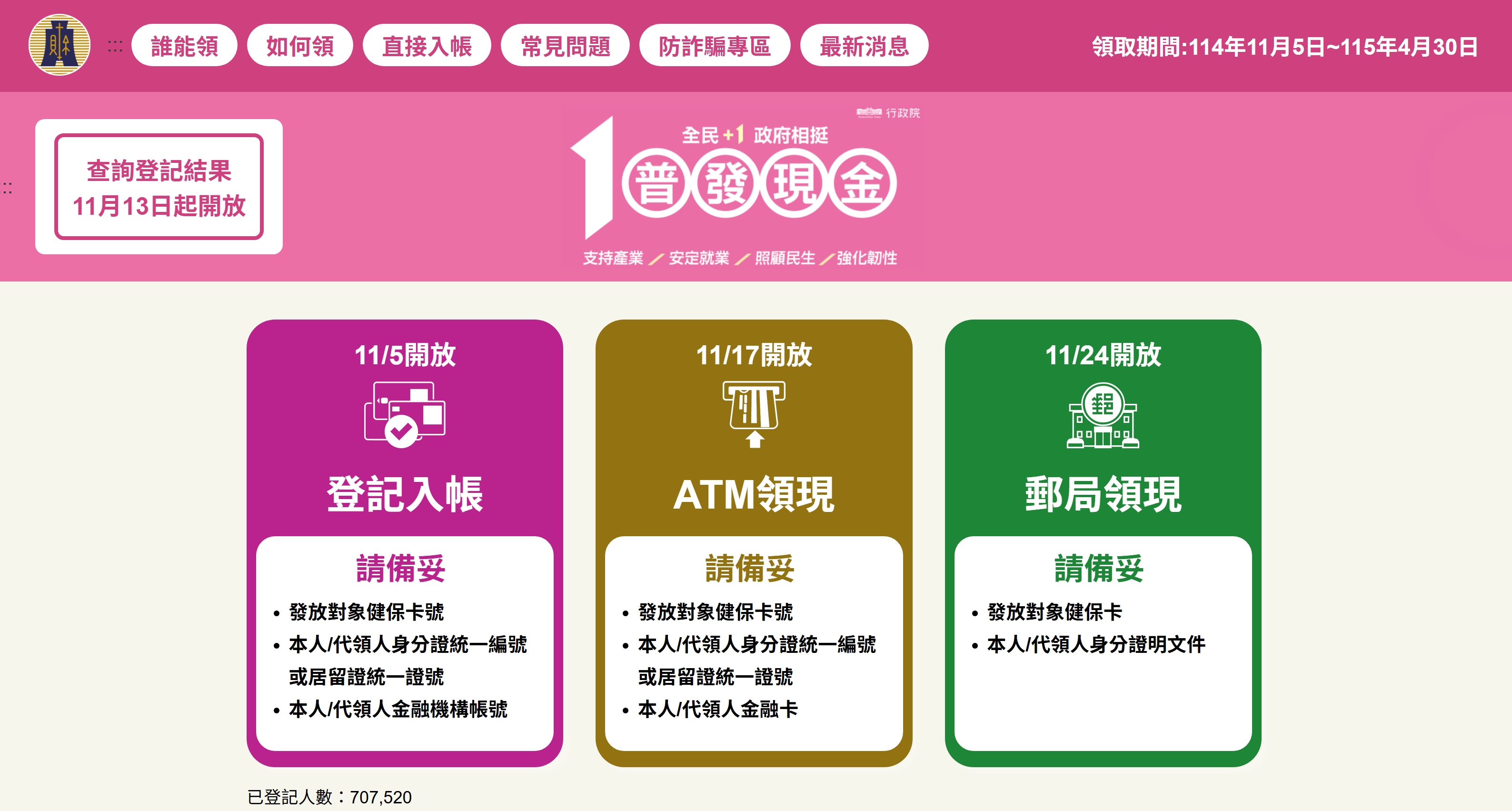 政府一萬網站已在 11 月 5 日上午 8 點開放普發現金登記,民眾有 6 個月的時間可以申請,到明年 4/30 截止領取。