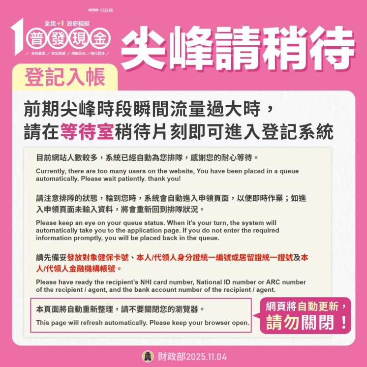 由財政部與各部會合作設置的普發一萬網站已在 11/5 開放登記,比照先前,前 5 天(11/5~11/9)採分流登記,第 6 天(11/10)開始取消分流,開放所有適用對象登記。
