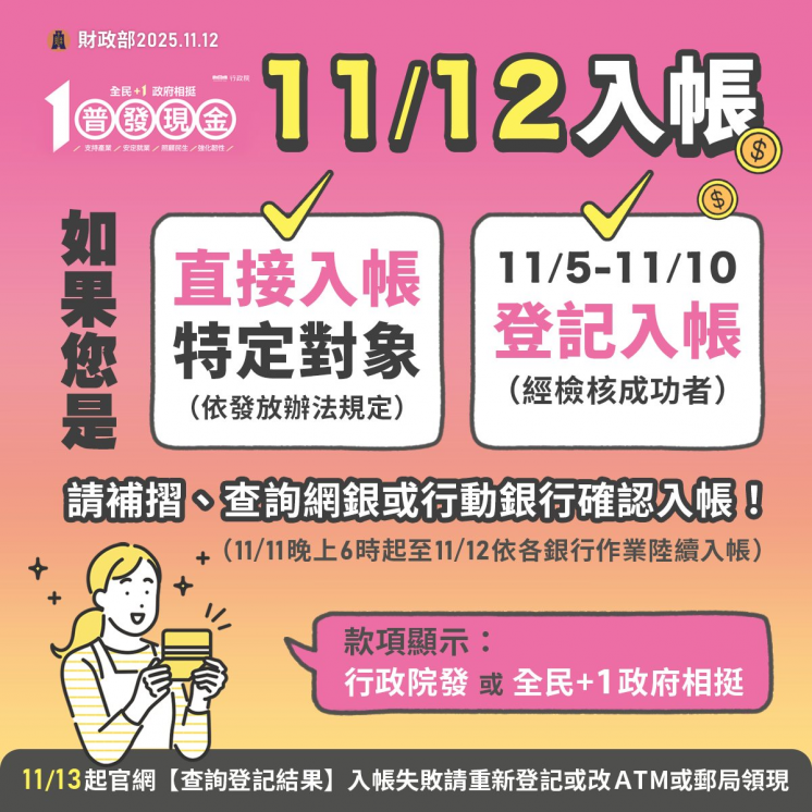 因應國際情勢,政府提出特別預算案,目前已經行政院核定發放現金辦法,並訂定一萬元現金發放時間在 11 月 11 日晚上 6 點起,依銀行程序撥款入帳。