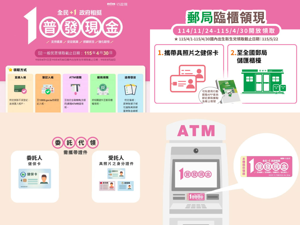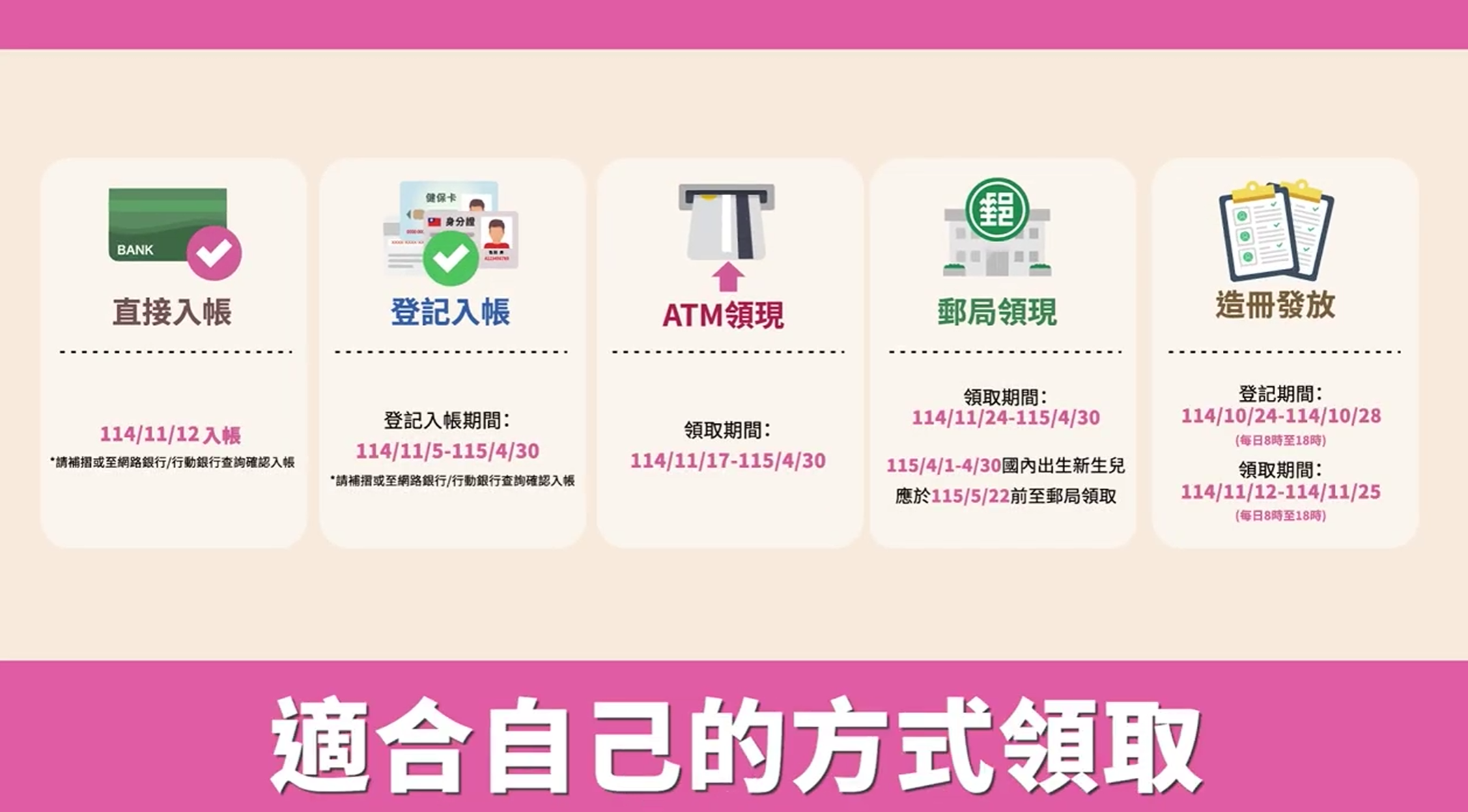 只要新生兒在 115 年 4 月 30 日前出生,同樣具備領取普發現金資格,可依據出生日期,由父母透過不同管道領取一萬元。若小朋友在 115 年 3 月 31 日當天或之前出生,可立即辦理出生登記和申領健保卡,按照一般民眾方式,使用登記入帳、ATM領現、郵局領現代領。