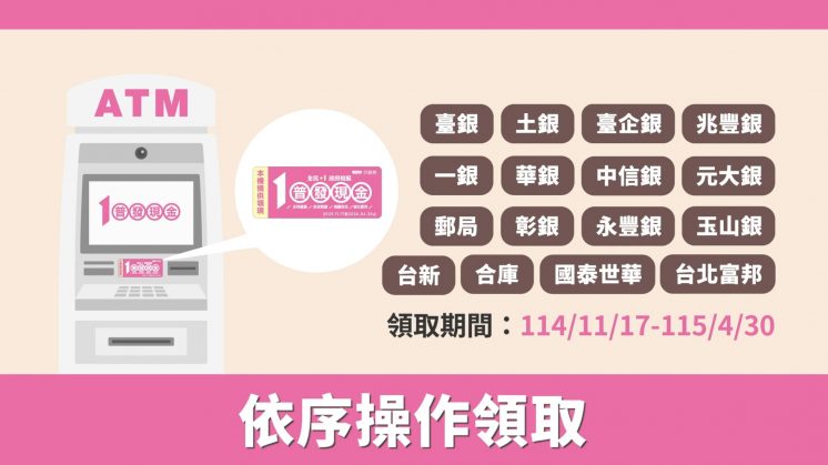 • 提領流程:至 ATM 插入提款卡並輸入密碼、持卡人身分證號或居留證統一編號、健保卡,即可領取一萬元現金。