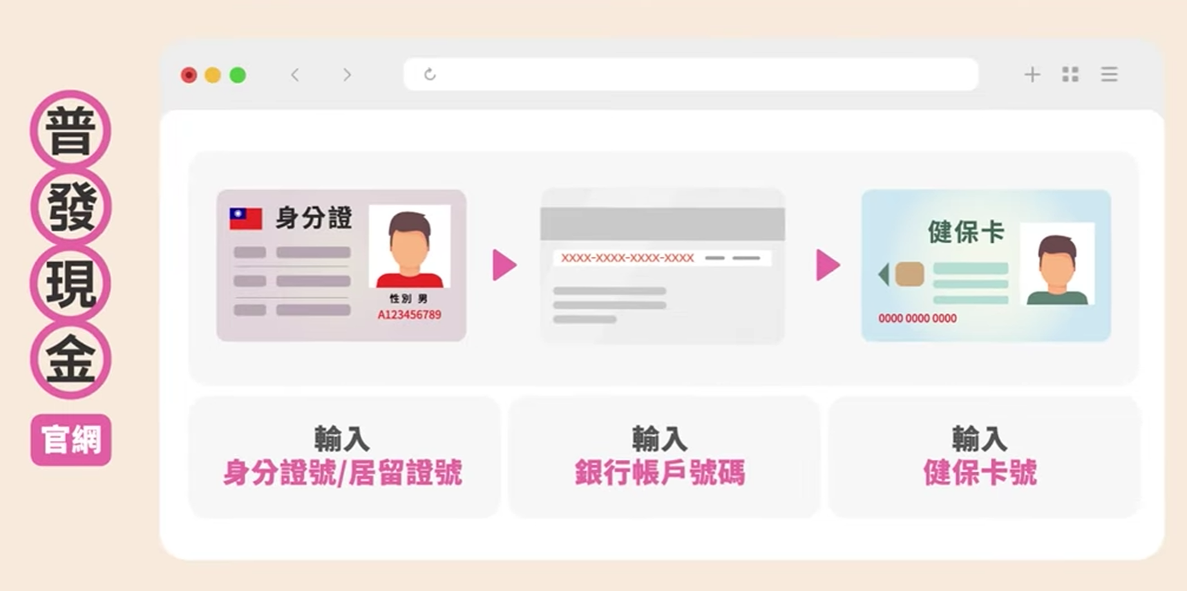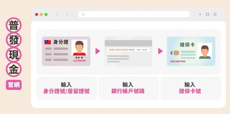在機台操作時,家長只要插入本人的提款卡,輸入密碼、自己的身份證字號及孩子的健保卡號(卡片左下角數字),即可領取普發現金。