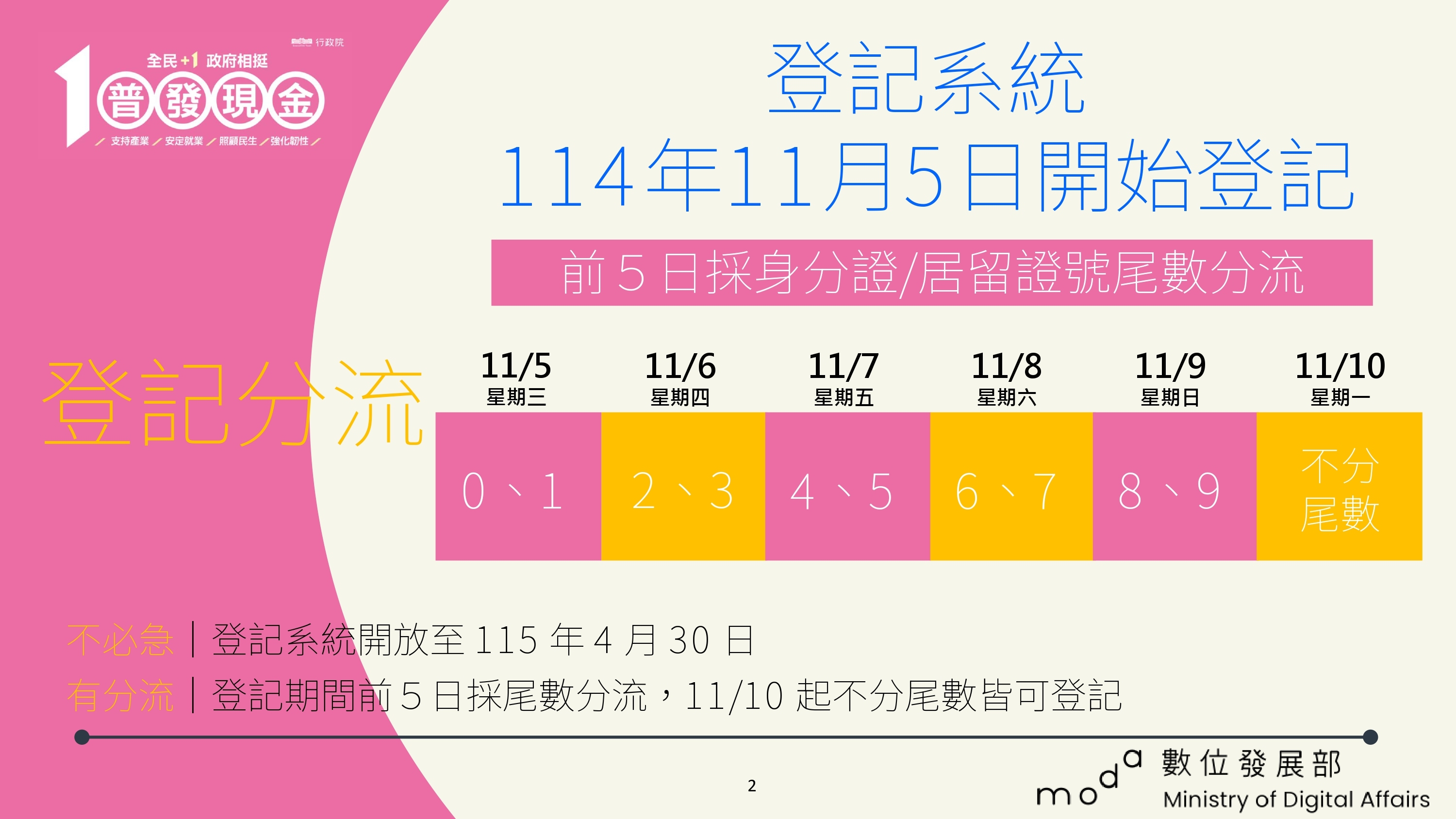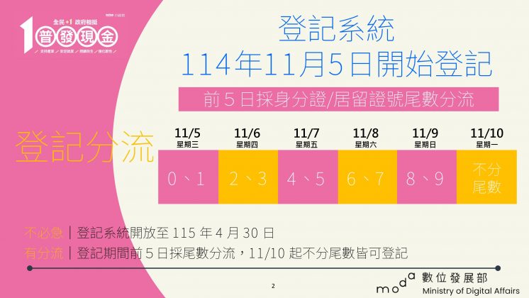 • 登記方式:至全民共享普發現金一萬網站(https://10000.gov.tw/)登記入帳,前五天採分流登記,11/10 起不限尾數,符合資格的民眾皆可登記。